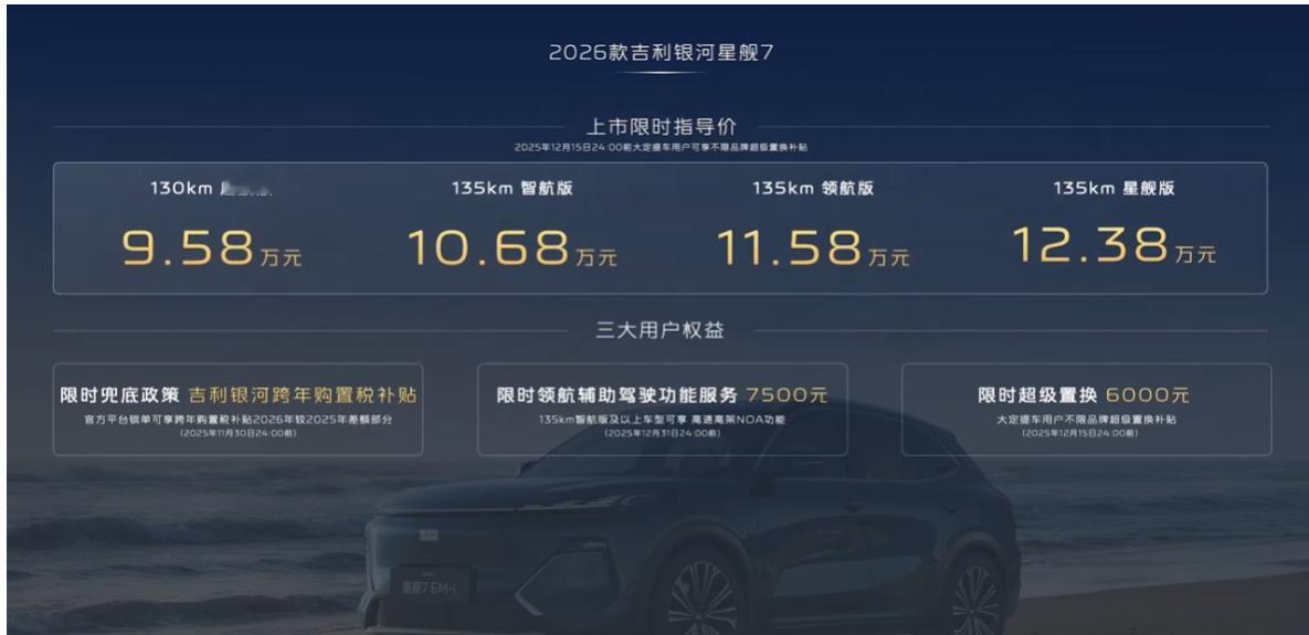 9.58-12.38万的星舰7比旧款香,比宋也不差了续航提升了,动力也提升了,最贴心还多了一个200km续航的包,所以总价13.38万就可以买到200km续航的星舰7了。对比旧款来说就是新的一代比旧的更好了。而且千里浩瀚H3也给到了,这价位来说比宋还是有点小优势的,你们觉得呢?基础参数:4750*1905*1680mm,轴距2755mm(紧凑型SUV)驱动形式:插混发动机:1.5L发动机功率:82kW电机功率:175kW电池容量:19.09kWh-29.8kWh电池:磷酸铁锂电池悬架:前麦弗逊后四连杆接近角/离去角:16/19°轮毂尺寸:18/19寸车机系统:Flyme Auto车机芯片:龙鹰一号外观颜色:银/白/黑/灰/绿/蓝内饰颜色:棕/灰/白9.58万 130km 启航版18寸轮毂/LED前大灯/车顶行李架/棉花座椅/主驾电调+副驾手调6扬声器/14.6中控屏+10.2仪表盘10.68万 135km 智航版千里浩瀚H3/前后泊车雷达/哨兵模式主动进气格栅/小蓝灯/全景天窗+遮阳帘/16扬龙鹰一号芯片/15.4中控屏+10.2全液晶仪表盘11.58万 135km 领航版副驾电调+前排通风加热/前排双层玻璃/电后备箱/50w无线充12.38万 135km 星舰版19寸轮毂+固特异轮胎/256色氛围灯/方向盘加热/前排按摩/后排加热可选配29.8kWh电池包其他权益:超级置换补贴6000元(车价已包含)7500元的NOA包10000元选配电池包(续航到200km)