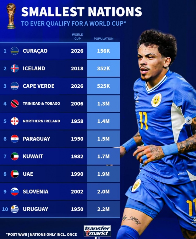 直播吧11月20日讯世预赛当前仅剩多个附加赛名额待定,库拉索以15.6万人成为二战之后晋级世界杯的人口最少国家,《转会市场》也统计了二战之后晋级世界杯人口最少的国家前十。