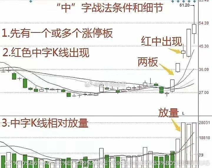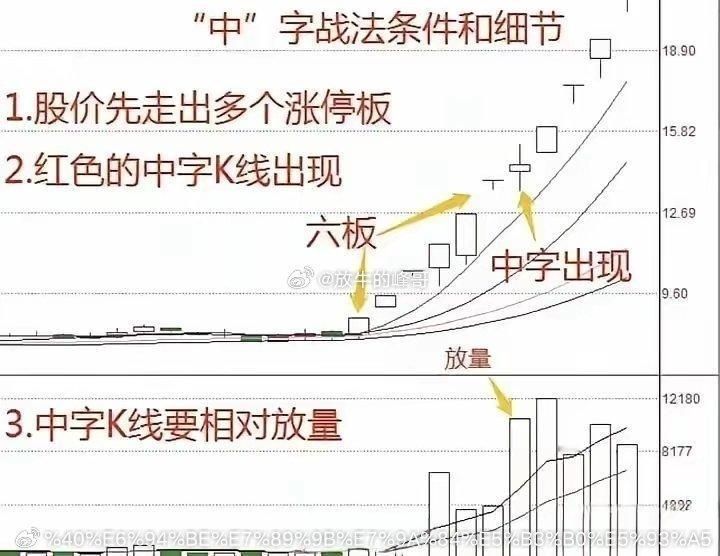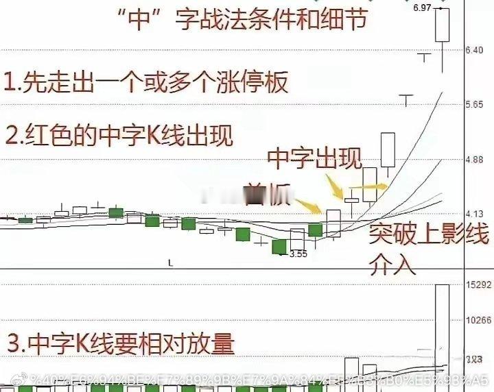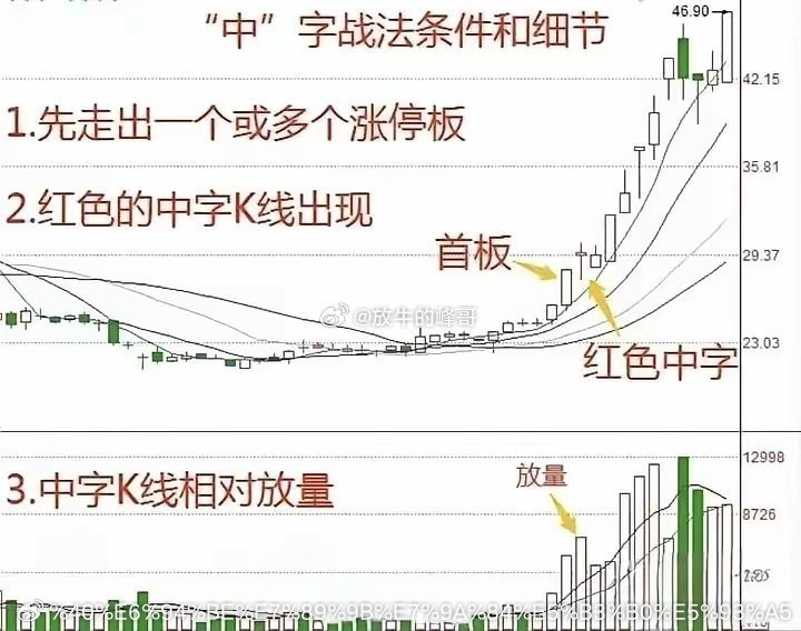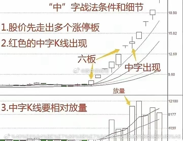 股市进阶📈 掌握“中”字战法,精准判断涨停板!股票市场中,有很多战法,涨停板更是如此。今天老股民分享新知识,“中”字战法条件和细节。希望大家好好收藏,慢慢研究思考学习。(如图所示)我们可以观察一下,很多连续涨停板的先例。从中我们也会发现很多有趣的现象。比如,一般情况下,都是必须连续放量的。也就是说,如果只有一天放量,那基本看看就行。从底部极度缩量后,第一个快速涨停开始,走出一个或多个涨停后,再缩量十字或中字洗盘方式,都会大概率继续上涨。需要注意的是:当一旦开始连续出现上长影线的时候,大家一定要提高谨慎,开始谨慎操作,或减仓操作或全部抛筹码逃离回避风险。其实,炒股技巧千千万,但万变不离其宗,我们只要认准一个形态,长期坚持下去一定会有意外的收获,出现认定的形态大胆买入,严格按规则卖出。炒股,最重要的是悟道,因为在悟道之前我们都是市场上的韭菜,韭菜只有被割的命运,想要不成为韭菜,那就只能通过不断地磨炼来悟道。股票市场中,有很多交易策略,低吸操作才是王道。