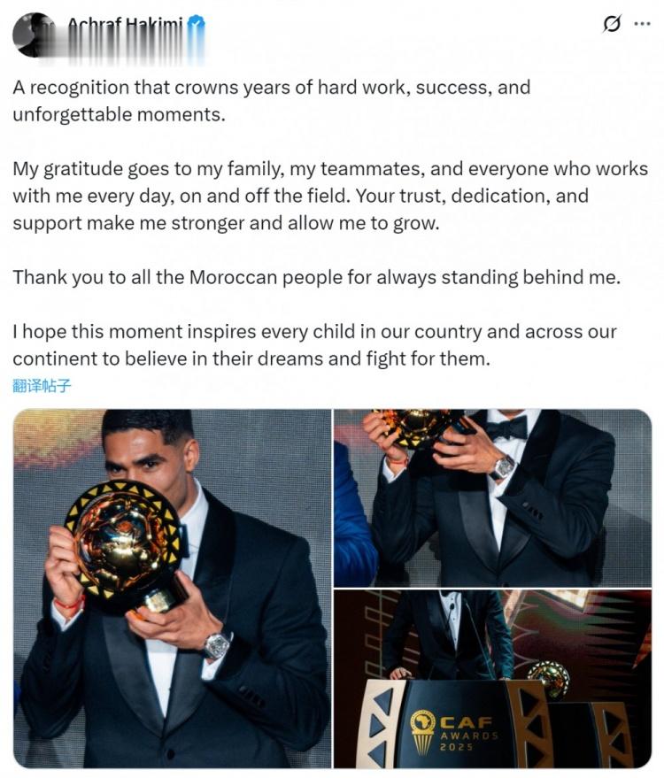直播吧11月20日讯阿什拉夫当选2025年非洲足球先生,他在社交媒体上晒出领奖照片,发表获奖感言。