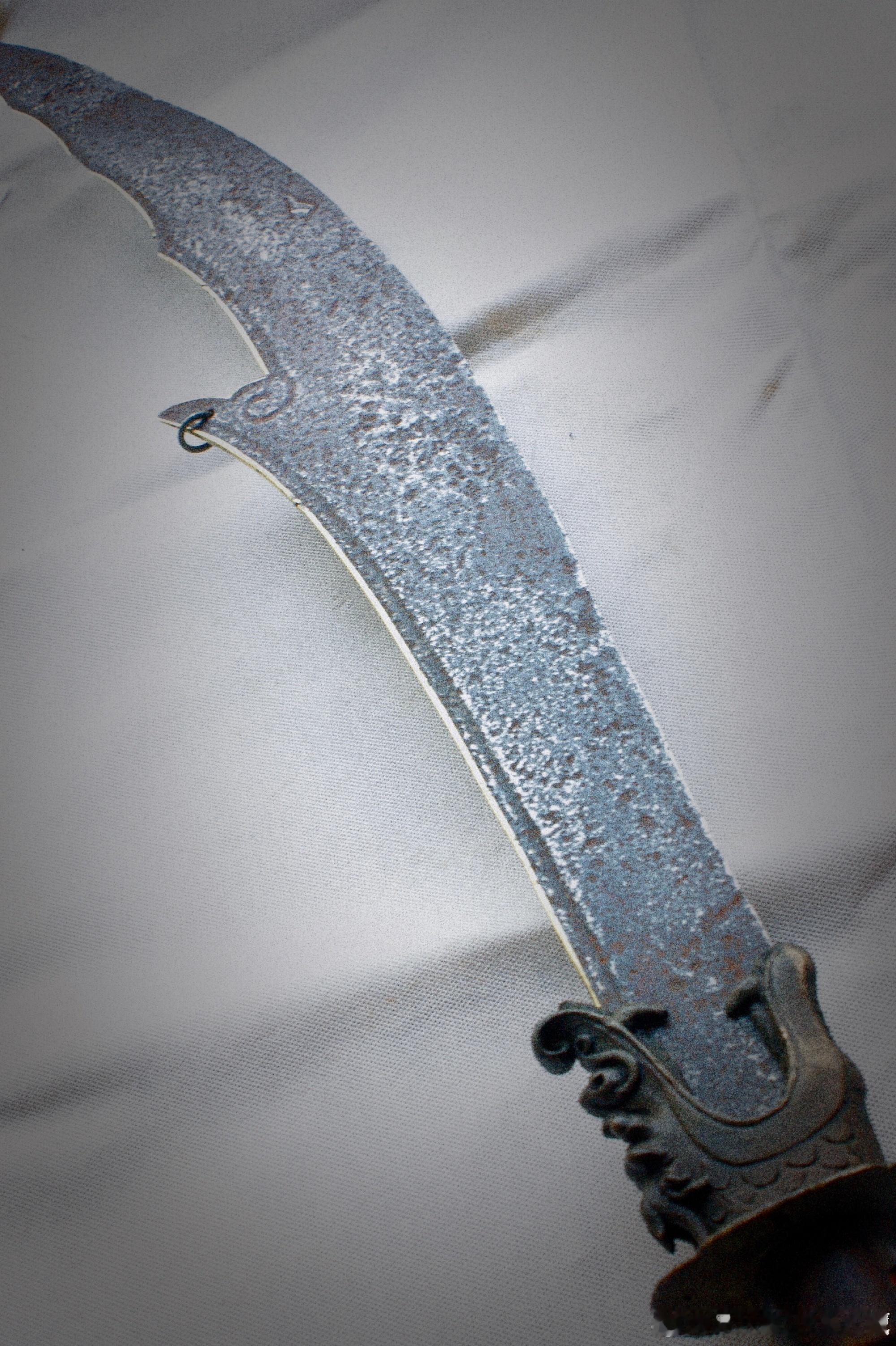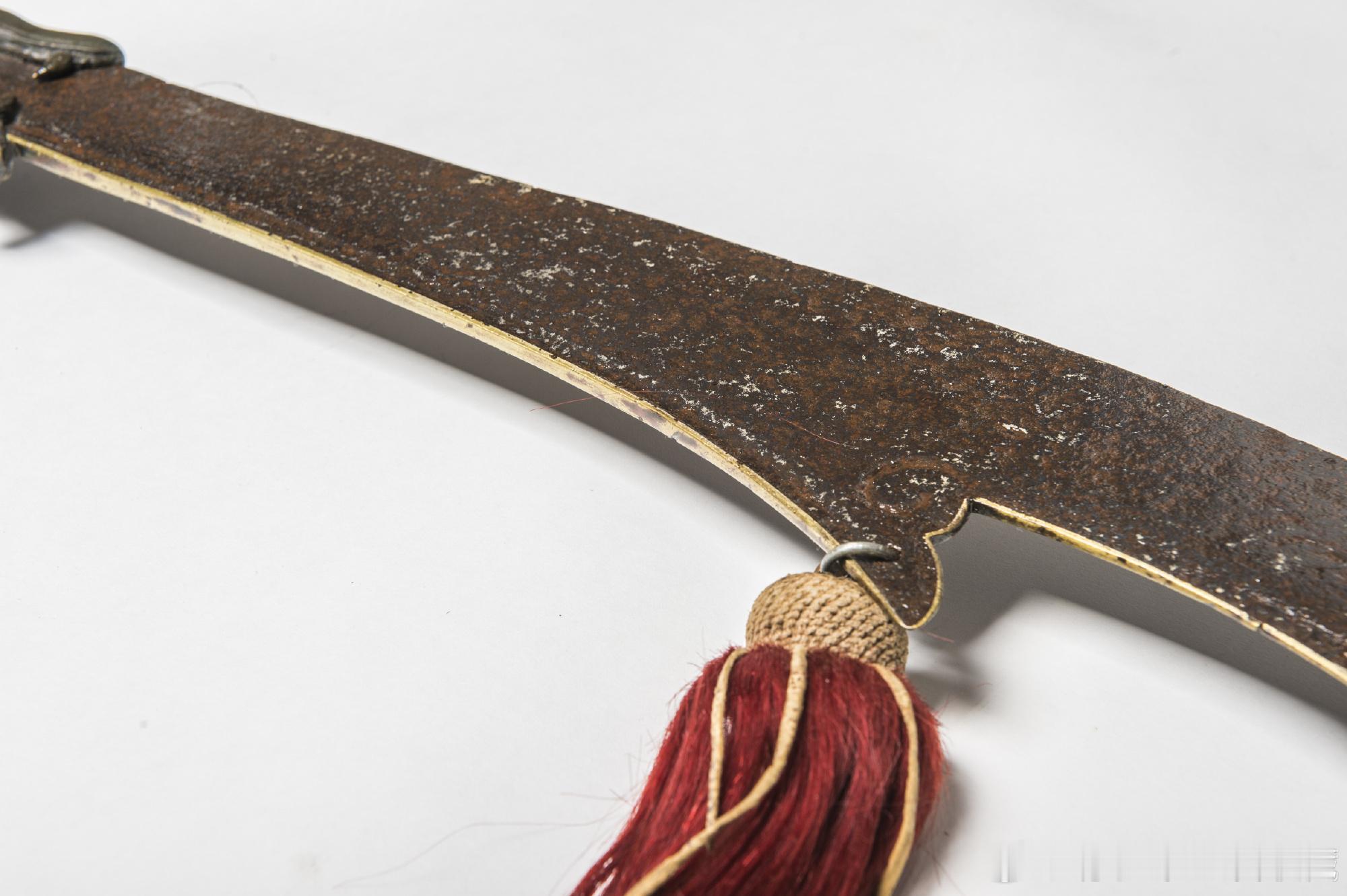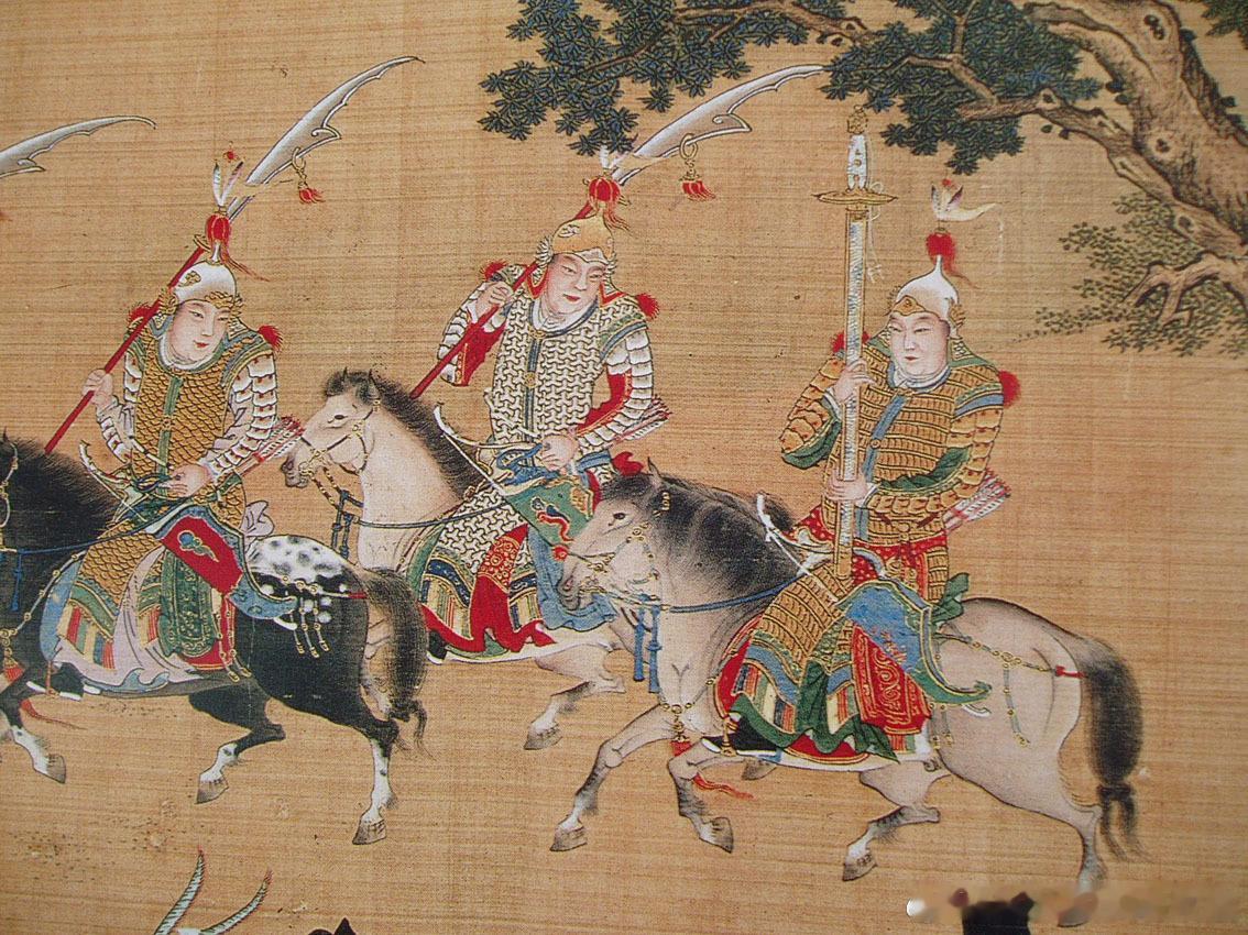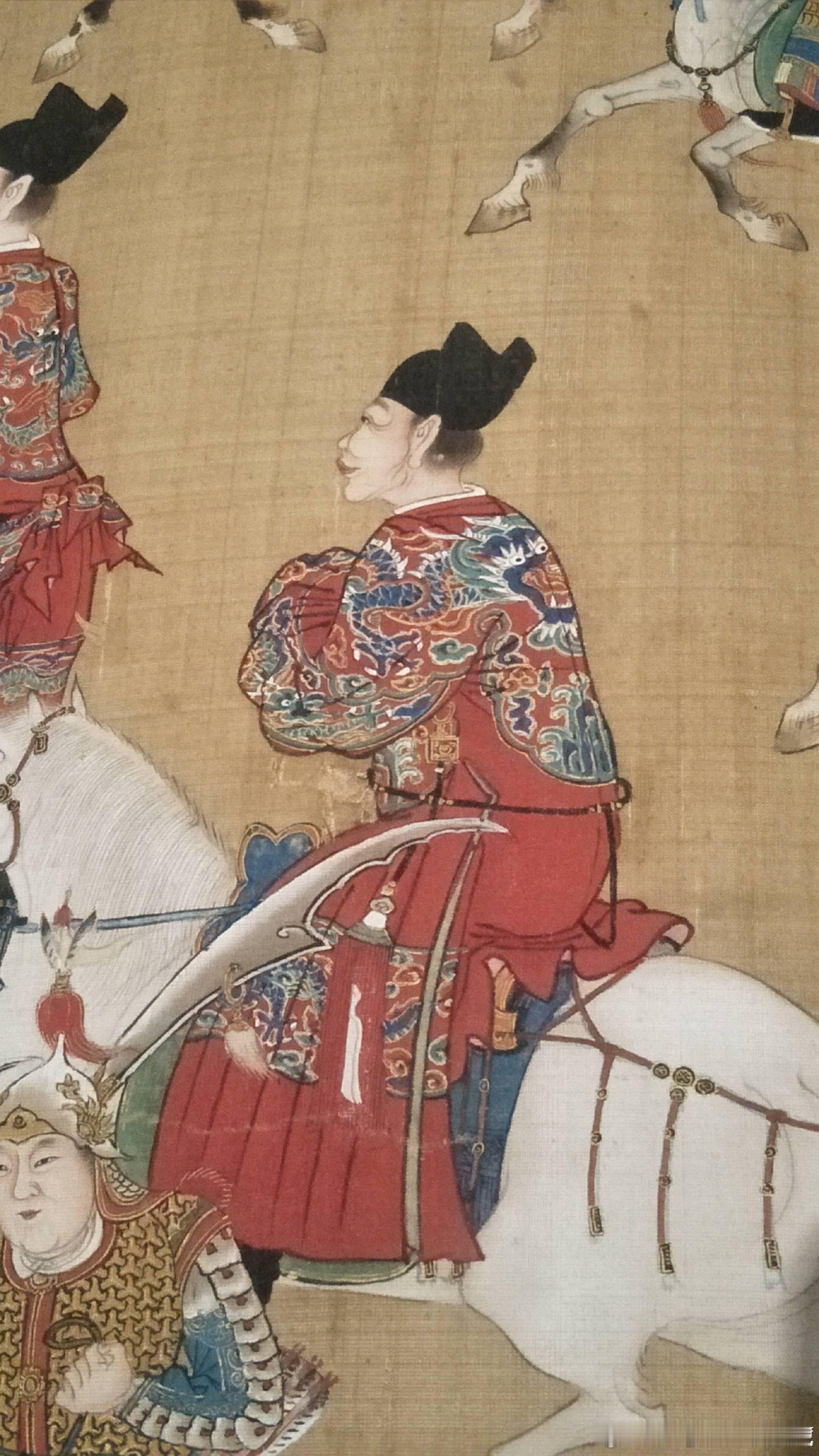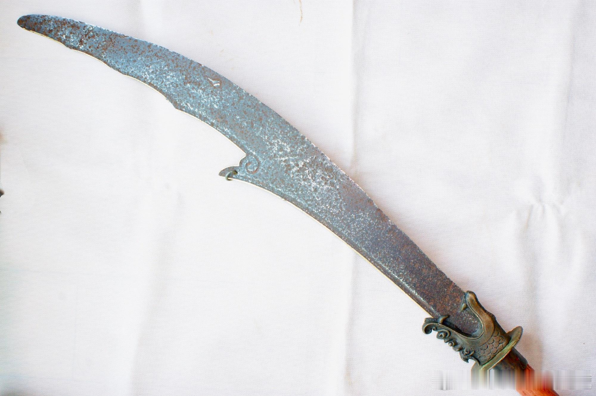 大明金背偃月刀 古时“金”与“铜”字很长时期通用。 较早时期,金是代表所有的金属,应以应用最广泛的铜为主,如秦始皇收六国的兵器铸造十二个铜人,就称作‘金人’。 在汉字中“铜”字出现的相当晚,记载汉文帝以铜山赐给他心爱的男宠邓通,似为铜字在古文献第一次出现。出土文物‘铜’字出现最早的也是在西汉,长沙西汉墓出土的铜灯,刻有“铜镫高一尺……”  铜字的出现并不意味着人们都能把金和铜分得很清楚,当然大商人、管财政的以及铸匠也许能分清。把铜制物称作金的习俗还流传了很久。 古代把黄金用于兵器上非常普遍。中国古代常常用黄金装饰刀剑矛戈,越王勾践剑和吴王夫差矛就是用错金工艺,在兵器上留下黄金鸟篆文字,还有采用鎏金、铸金、包金等工艺装饰兵器。 刀、剑、箭等兵器也常用金表示,如《荀子•劝学》中说金就砺则利。又如,金吾(铜制仪仗棒);金猊(用金属铸成狻猊状的香炉);金钩(刀名);这里的兵器的金基本就指铜制。 偃月刀实为宋朝开始出现,后附会于关羽之兵器,俗称关刀。最出名的莫过杨家将“金刀杨令公杨业”,推测杨令公使用的是不是金背关刀? 明代中叶抗倭战争中,明军在抵御日本雉刀时,也大量使用称为关公刀的偃月刀,以挥砍为主,其尺寸大,刀形雄壮,辟砍有力,对付当时倭寇铠甲和大量使用的日本雉刀极为有效,明晚刘铤尤善使用偃月刀,世称“刘大刀”。 金背偃月刀龙吞为明翻鼻龙,刀姿修长俊朗,与明神宗皇帝出警入跸图所绘御林军锦衣卫所持偃月刀形制完全一致,并且刀背镶有黄铜包边,犹如金背,是罕见的明仪仗用金背偃月刀实物。 图八、九为《出警入陛图》中的偃月刀。