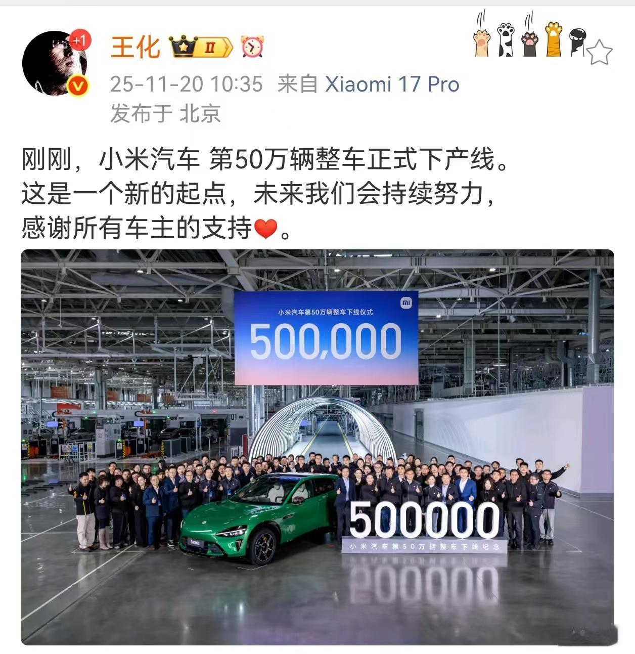 “刚刚,小米汽车第50万辆整车正式下产线。”小米集团公关部总经理王化11月20日上午在其个人微博发文宣布了小米汽车的最新进展。他表示,这是一个新的起点,未来我们会持续努力,感谢所有车主的支持。