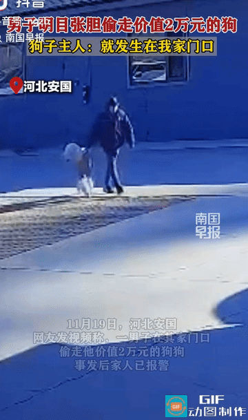 这么巨大的狗狗也太乖了吧!河北,一男子明目张胆的在家门口偷走了一条价值2万的品种巨贵狗狗,狗主人: 估计就是附近的人。 孙先生养了一条巨贵宠物狗,事发当天他发现狗狗不见了,立马查看了监控,监控中一男子就强制性的牵走狗狗,这才得知自己的狗狗被人给偷走了。 从监控中看到,狗狗不愿意走,那个人就使劲的拽,狗狗只好一步三回头看看家的方向,这一刻它最希望看到的是,它的主人奔跑过来把它带回去吧。 根据,孙先生称,这个狗狗他养了有两年了,品种是巨贵,价格在2万元左右,孙先生怀疑作案的人应该是附近的熟人。 这么大的一条狗,咋这么乖呢? 被陌生人牵走,怎么都不叫一声,这也太温顺了吧。 现在这个季节,不怕一万,就怕万一,希望能尽快找到吧,这个毛孩子也太可怜了。