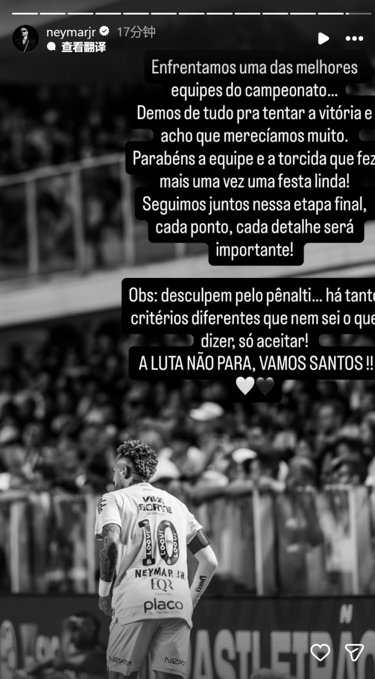 “对于点球判罚,我深表歉意,裁判标准如此不一,我无话可说,只能接受!战斗永不停歇,加油,桑托斯!”