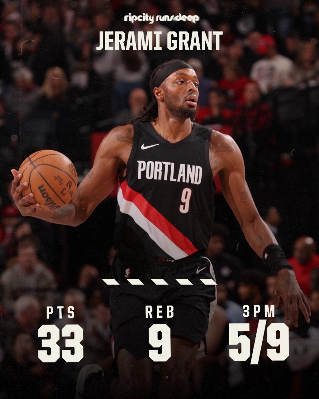 本场比赛,开拓者球员杰拉米-格兰特出战36分钟,18投10中,其中三分球9投5中,罚球10投8中,空砍33分9篮板4助攻。