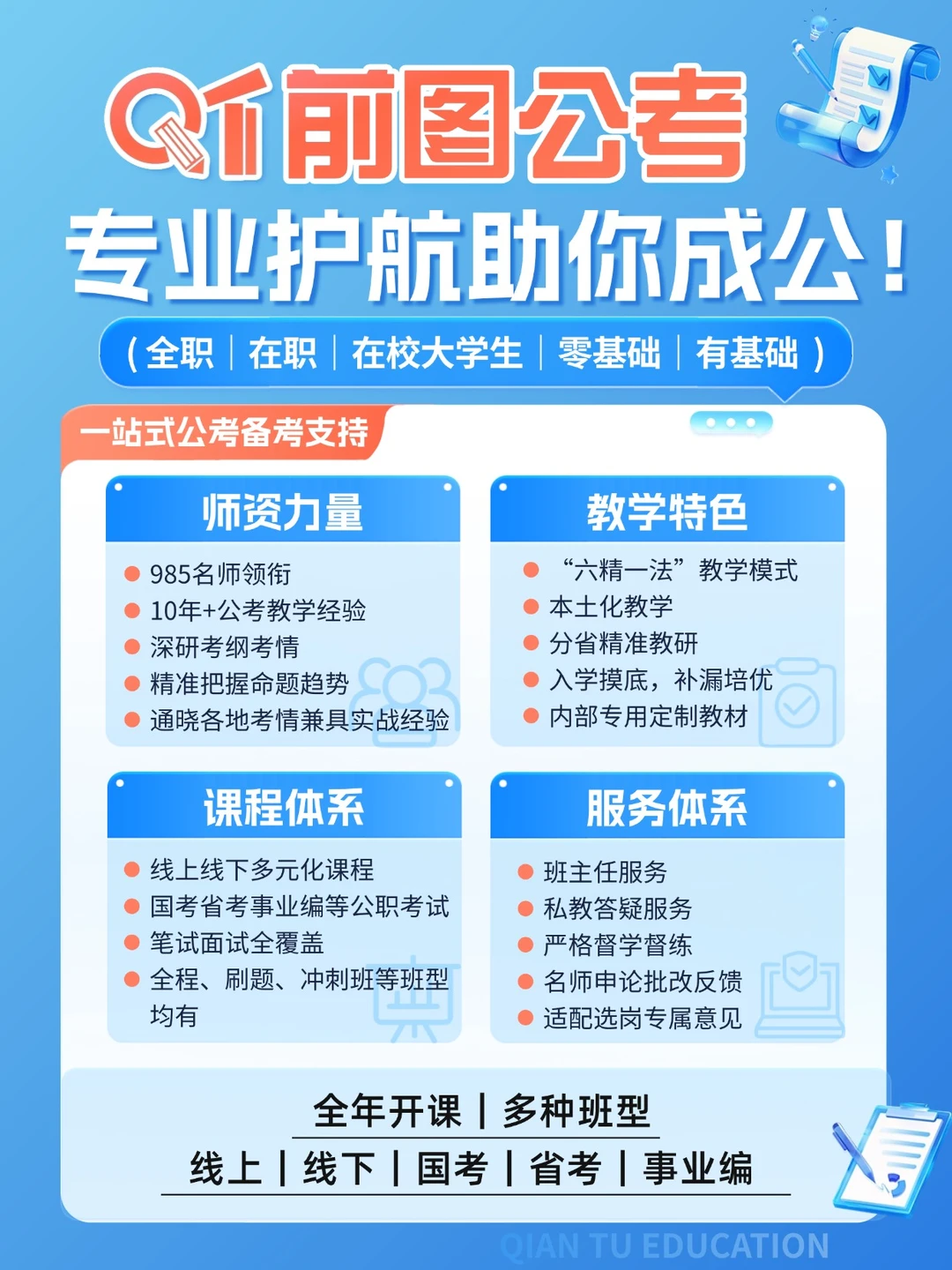 现在报班失败无非两种情况: 要么是花 1w+报公考班,结果入坑后发现根本不值,要么就是花几千报了个班,发现还不如自学,虽然钱少但是也相当于打水漂了。 考公钱要花在刀刃上,前图6V1公考班,不到1W的投入,给你从笔试到面试、从学习到选岗的全链路上岸保障,让你备考不再“单打独斗”! ⭕学习方面 ✨【课程硬核】26 届理论 + 技法 + 省份刷题 + 模考 + 时政 + 冲刺(录播 + 直播),27 届新增考霸刷题、国考冲刺直播,考点层层拆解,学完就能用! ✨【师资大牛】985 师资线上授课,把行测申论难点变 “秒懂技巧”,备考效率直接拉满! ✨【资料管够】26+27 届超 50 本讲义分两次包邮,电子讲义随时看,碎片时间也能刷题! ⭕服务方面 ✅1v1定制学习计划:报班后会做一个摸底测试,然后老师会帮你制定针对性计划,够一够就能达到 ✅1v1选岗指导,根据你的学历、目标、意向来定目标,筛选优质岗位 ✅1v1全程督学伴学:每天都有人喊你起床、给你打气、监督你学习,备考路上不孤单~ ✅3v1私教答疑:每个学生都有3位专属答疑老师,行测五大模块、申论有啥不懂随时问,讲解超细致 ⭕价格 💰4k~9k不等 🎁部分班次赠送【国考冲刺、事业单位、面试班】等额外课程、【买一届送两届】的兜底保障,相当于多一次上岸机会!性价比超高! ⭕适合人群: ✅ 大三及以上在校生 ✅ 本科及以上学历毕业生 ✅ 在职备考党 ✅ 多次备考遇瓶颈 ✅ 自制力差需监督 考公报班公考机构考公线上班