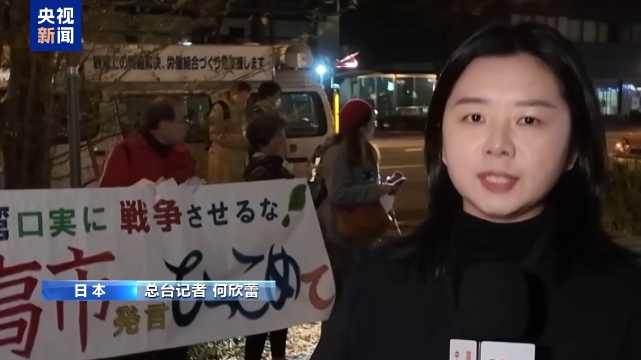 总台记者何欣蕾:日本首相高市早苗近期涉台的错误言论在日本国内持续引发抗议和不满。19日在京都市役所前,当地民众自发举行集会,抗议高市的错误言行。像我身后的条幅,上面就写着“不要拿台湾作借口,挑起战争,高市早苗撤回言论”,以此来表达民众的心声。