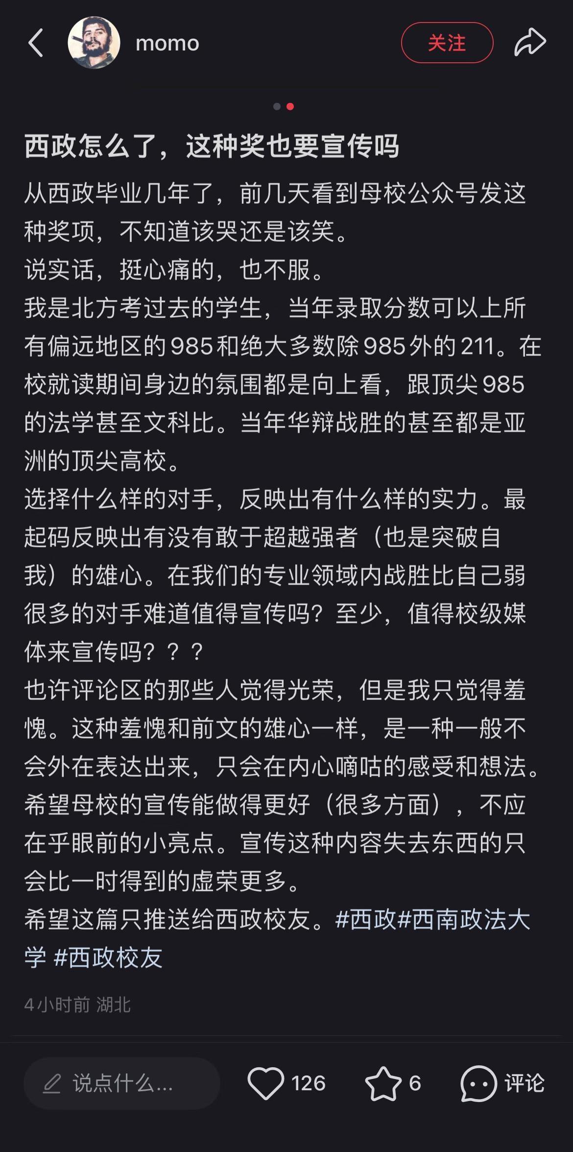 你自以为的“痛心”,不过是傲慢和功利心。 作为西政人,先亮明立场:你的“羞愧”我读不懂,但你的片面与傲慢,我必须说清楚。 首先,你以当年的高考分数和华辩战绩为傲,说明你本该懂西政精神的核心从不是“只赢强者”,而是“尊重每一份努力,包容每一种成长”。 校级宣传表彰的可能是低年级战队的首次突破,是冷门赛事里的逆势翻盘,是一群普通人拼尽全力的结果——这些成绩或许没站上“亚洲顶尖”的舞台,但对当事人而言,这份坚持配得上母校的掌声。 你用“战胜弱者”轻飘飘否定,既无视了参赛者的汗水,也曲解了宣传的意义:宣传从不是“晒最强战绩”的虚荣心游戏,而是记录校园里每一个向上的身影,这恰恰是西政“兼容并包”的底色,你当年引以为傲的“向上氛围”,不也正是由无数这样的“小亮点”堆砌而成? 其次,“偏远地区985”“比自己弱很多的对手”这种表述,暴露的不是你的雄心,而是你的偏见。高校无高低之分,赛事无绝对强弱之别,能站上赛场的都是勇者,凭什么用地域和过往标签给他人贴“弱者”标签?西政的骄傲,从来不是“能赢多少顶尖高校”,而是“无论对手是谁,都保持专业与尊重”“无论成绩大小,都认可努力的价值”——你口中的“雄心”,本质是“唯结果论”的功利心,这恰恰背离了母校教给我们的“理性与包容”。 最后,你说“宣传这种内容会失去更多”,但真正让西政人不适的,从来不是一份普通的表彰,而是校友用自己的“高标准”绑架母校的宣传,用片面的情绪否定策划组各位老师同学的用心和校园的多元成长环境。 你当年选择西政,是因为它的法学实力;但你如今苛责母校,却忘了它除了“顶尖战绩”,更有“以人为本”的温度。这份“恨铁不成钢”或许出发点是爱,但包裹的却是傲慢与偏见——真正的西政人,会为母校的顶尖成就骄傲,也会为每一个普通人的进步鼓掌,而不是站在过往的光环里,对母校的包容与温情指手画脚。 母校的宣传从不需要迎合某个人的“雄心”,它只需要忠于校园的真实与温暖。如果你觉得这样的西政让你“羞愧”,或许该反思的不是母校的格局,而是你自己是否还保有当年那份纯粹的敬畏与谦逊。