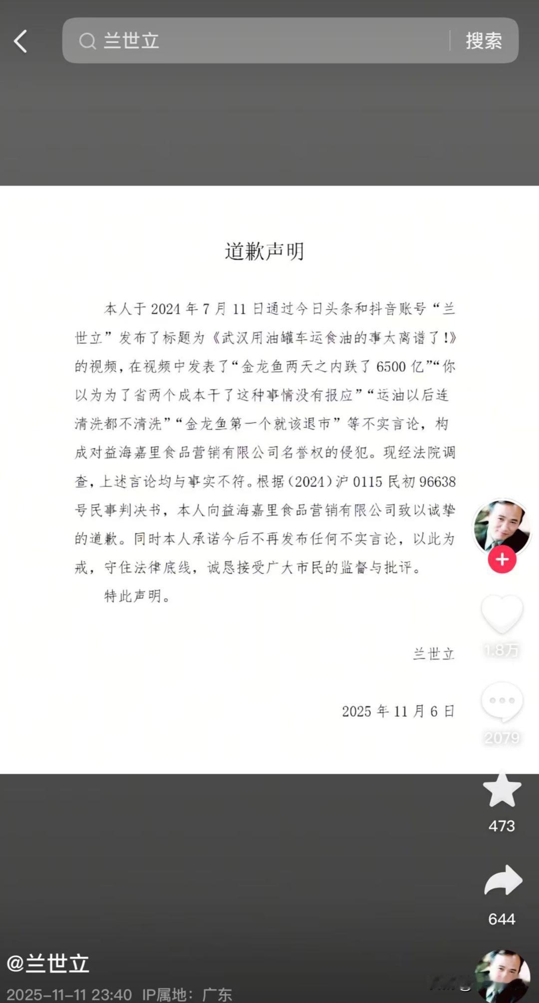 湖北前首富兰世立公开向金龙鱼道歉这事挺有看头。2024年7月,他发视频说“金龙鱼两天之内跌了6500亿”“运油以后连清洗都不清洗”“金龙鱼第一个就该退市”等言论。结果益海嘉里公司把他起诉了,经上海两级法院审理,认定他侵权。 兰世立遵照判决在抖音发了道歉声明,赔了1万元和律师费。不过他对判决认定其缺席审判等问题有不同意见。其实当时“油罐车混装运输食用油”事件引发关注,金龙鱼也声明有严格监管。这事儿也给大家提了个醒,说话可得有依据,不然就得为自己的言论负责。 从这件事中,我们能看到网络言论的边界。在如今信息传播迅速的时代,每个人都有表达观点的权利,但这份权利绝不能被滥用。兰世立作为公众人物,其言论具有一定的影响力,一句未经证实的话可能就会给企业带来巨大的冲击。 对于金龙鱼而言,面对不实言论选择用法律武器维护自身权益,这是值得肯定的做法。企业的声誉是其发展的重要资产,不容随意诋毁。而法院的公正判决也体现了法律在规范网络言论方面的重要作用。 这件事也给广大网友上了一课。在网络世界里,我们不能仅凭主观臆断就随意发表言论,在表达之前要多去求证事实。否则,可能就会像兰世立一样,不仅要公开道歉,还要承担相应的法律责任。希望未来大家都能在法律框架内,理性、客观地表达观点,共同营造一个健康的网络环境。