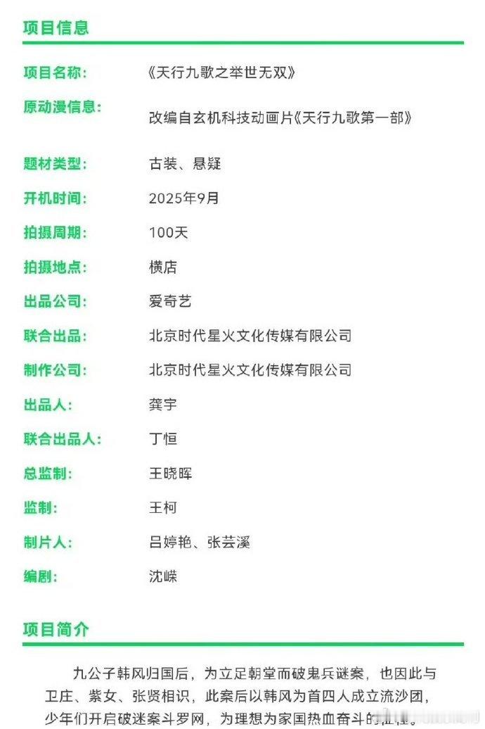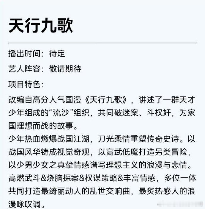 陈飞宇的武打戏一直很利落,之前《将夜》《献鱼》里的打戏都让人印象深刻。《天行九歌》里的动作场面不少,期待他带来行云流水的精彩表现。