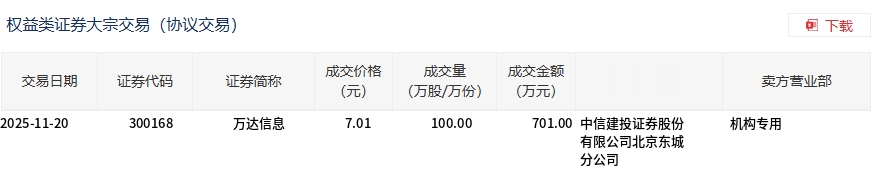 11月20日,万达信息大宗交易成交100万股,成交额701万元,占当日总成交额的4.85%,成交价7.01元,较市场收盘价7.05元折价0.57%。