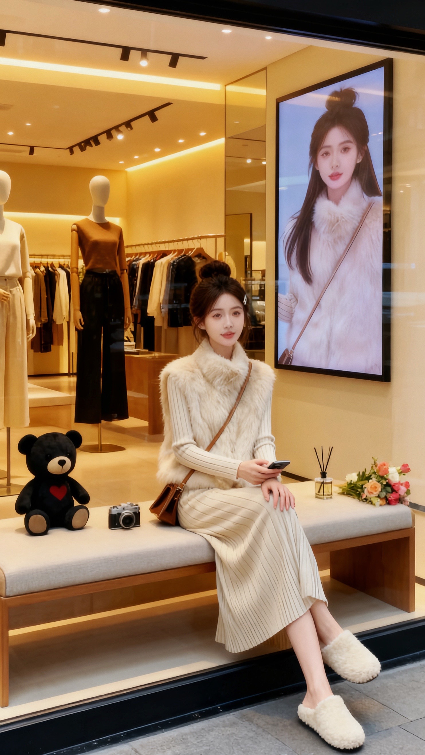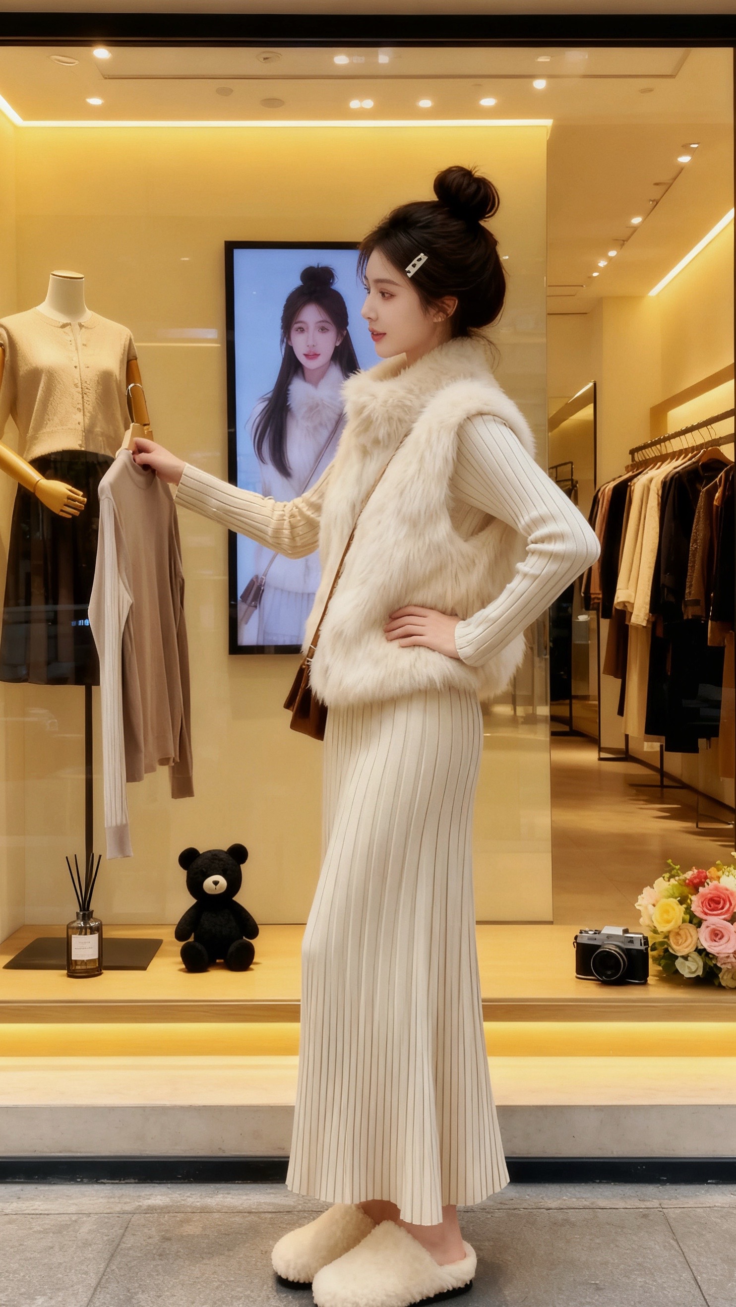 冬日贵气感直接焊在身上!奶杏色毛绒马甲裹着软乎乎的温柔,搭同色系针织长裙,慵懒又显贵✨暖光橱窗里的摆件衬得氛围软软的,窗外飘雪街景一衬,像把冬日的温柔都穿在了身上~高级感穿搭 女人味穿搭 减龄气质 气质女神穿搭 精品女装搭配