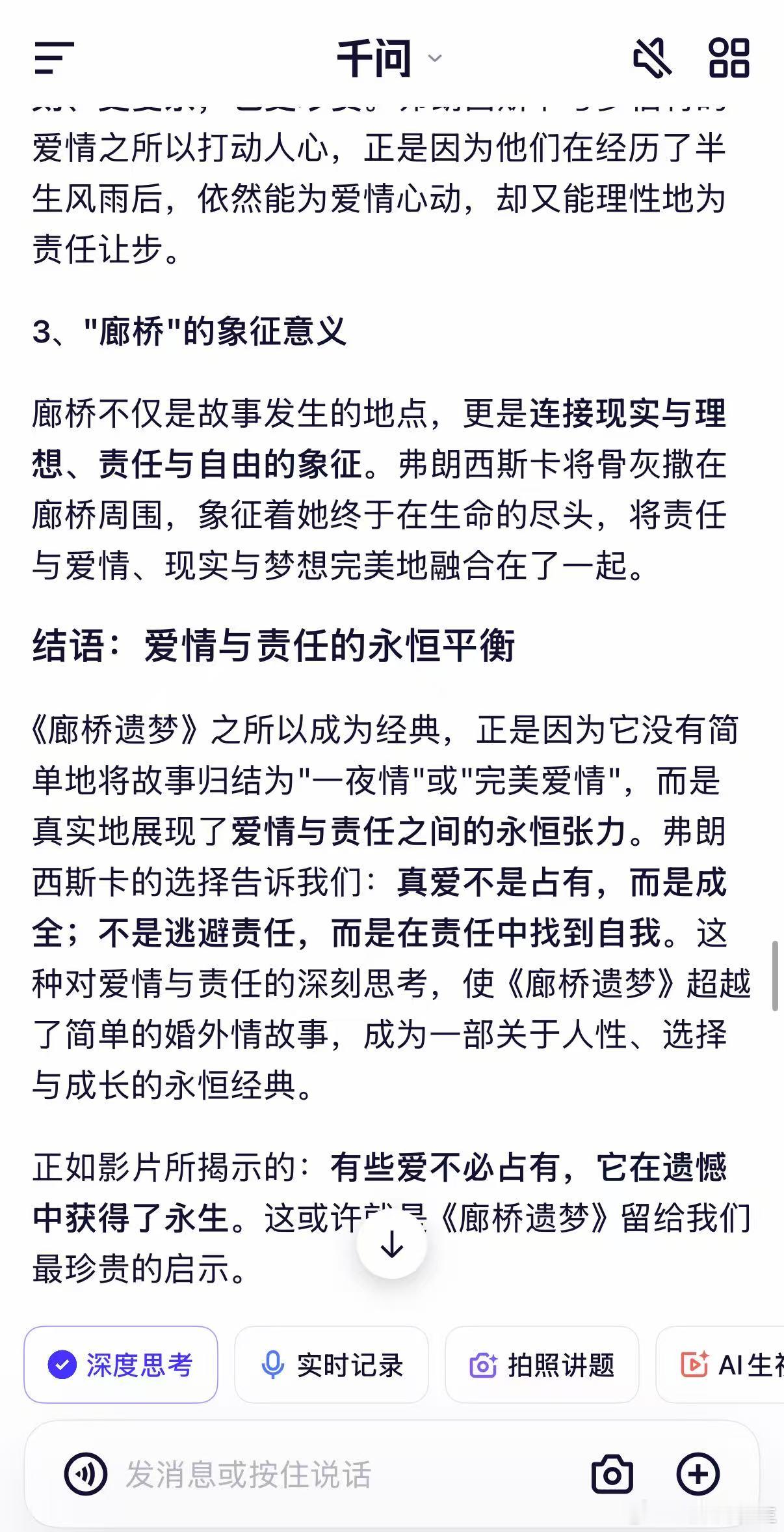 对于《廊桥遗梦》,有的人会觉得男女主相爱是“一夜情”,有的人则认为是真爱与责任的选择。但没想到千问一个AI聊弗朗西斯卡的选择能如此通透!“她不是选爱情还是责任,是问自己我究竟是谁?” 走了会失去家庭,留了会失去自我,“无论怎么选都会失去一部分自己”。当炽热的爱情与现实责任冲突,“她的悲剧是时代不给第三条路”,不是她的错,是牢笼。对比现在的“爱情自由”,突然懂了电影里那句“有些爱只能活在记忆里”。