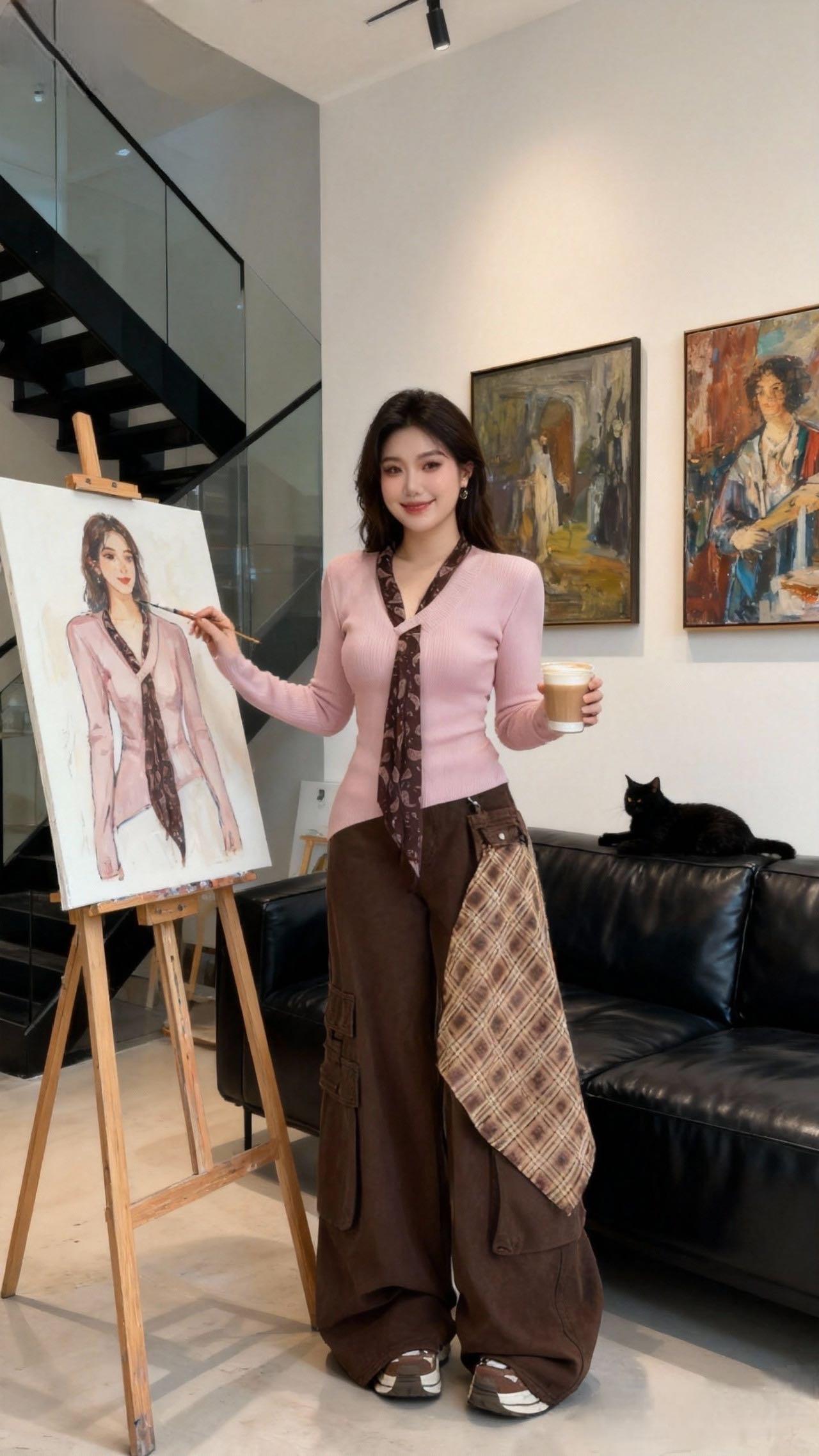 💖今日的艺术感穿搭太戳我啦!粉棕配色温柔又有质感~ 这件粉色V领针织衫贴身又显瘦,搭配带有复古花纹的丝巾,瞬间让基础款变得很有层次。下装选了这条棕色工装裤,侧边的格纹拼接设计超有个性,宽松的版型还很藏肉呢~脚上的复古运动鞋舒适又百搭。 在画室里穿着这套,一边画画一边喝咖啡,连猫咪都忍不住多看两眼,艺术感和日常感平衡得刚刚好,姐妹们快试试这种风格!粉系少女感穿搭 浅粉色系穿搭 灰色粉色系穿搭 粉棕色穿搭 粉色调穿搭 灰粉色系穿搭 玫粉色衬衫穿搭 粉绿色穿搭 美女人像群 高清美女