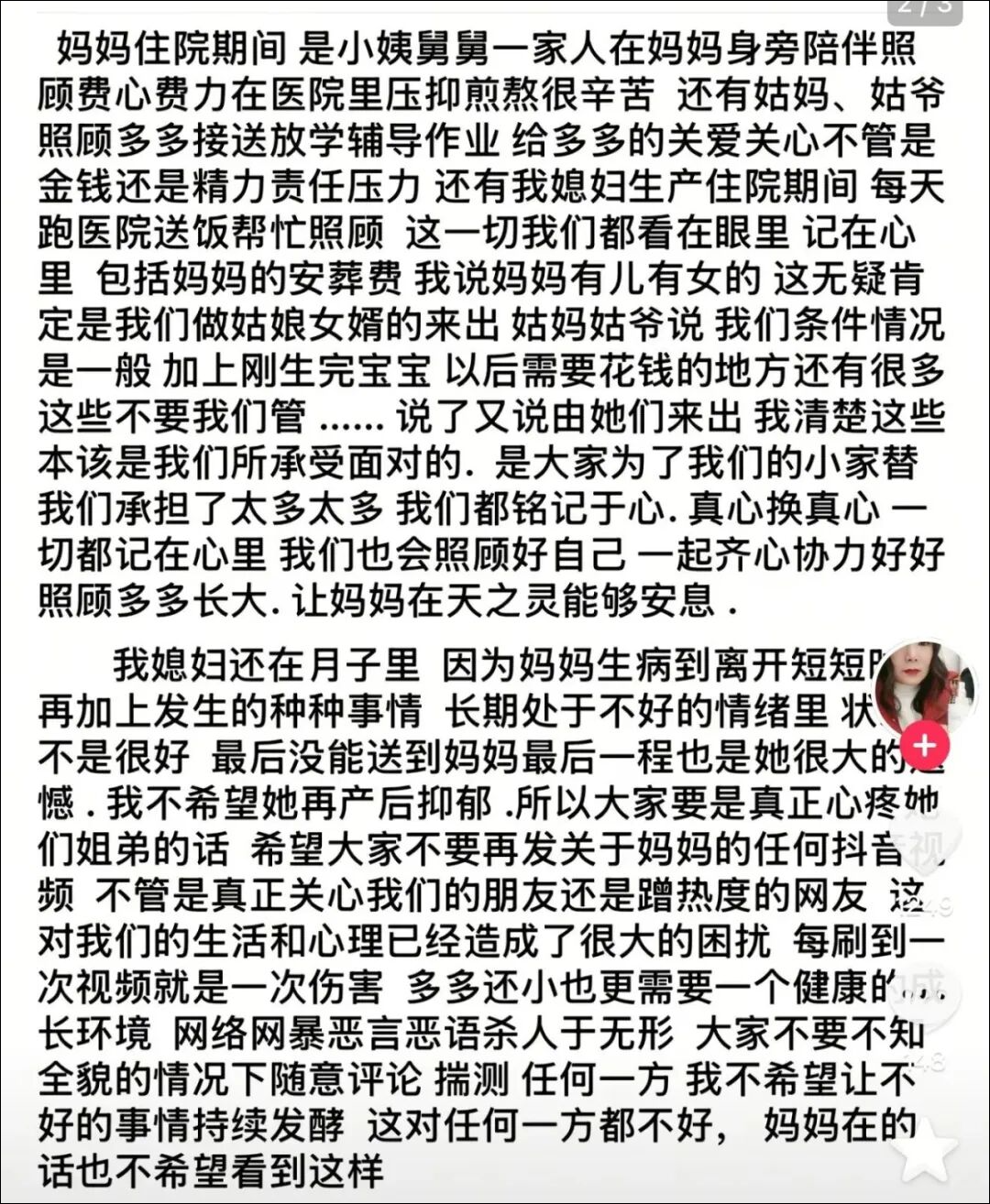 之后该博主女婿再次发文怀念母亲,并呼吁大家不要对此事胡乱猜测和网络暴力其家人。