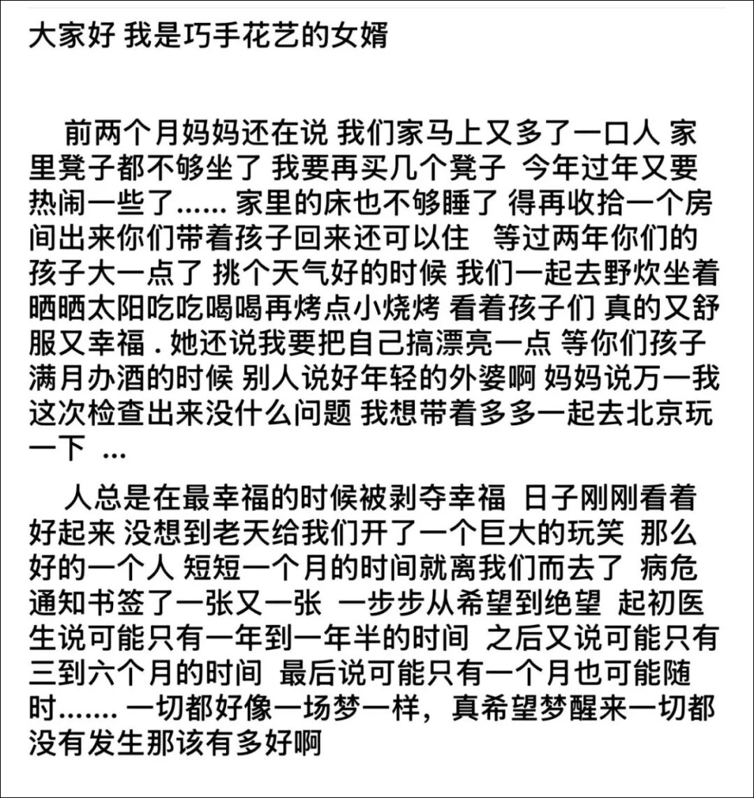 该博主还称:“我还有好多心愿没有完成,女儿15号预产期就到了,我还没有伺候月子还没有帮她带大孩子,我家多多才9岁,还有很多事情没有把他教会,叫我怎么能放心走。”