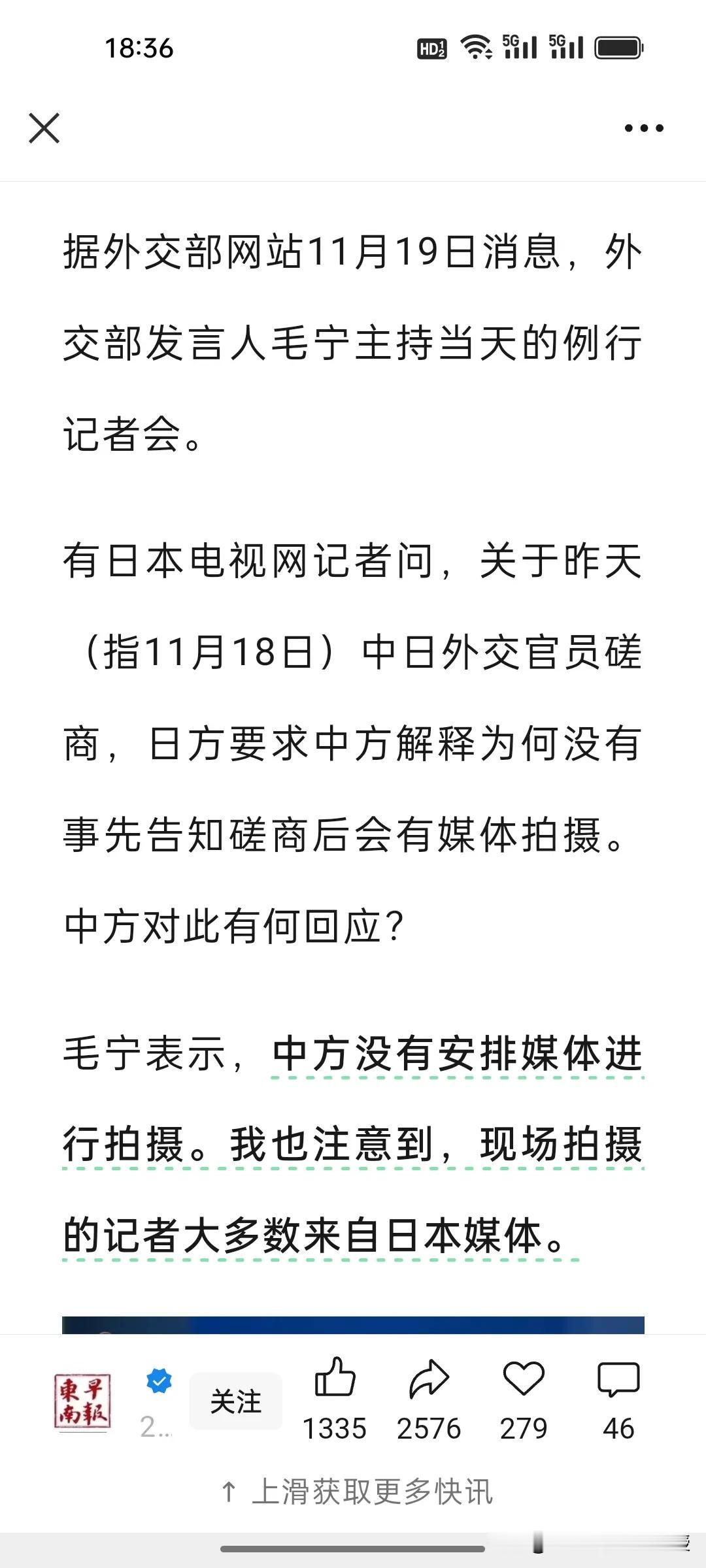 日本这真的是自己打脸啊!根据《东南早报》报道,日本电视网记者问,为什么没有事先告知中日双方磋商结束后,门外有媒体记者拍摄?外交部发言人毛宁称,中方并没有安排媒体拍摄,现场大多数来拍摄的都是日本媒体。 日本媒体感到不舒服的无非就是金井低着头像小学生被训话一般的场面,然而我们的刘司长穿着五四青年装,威武霸气,双手插兜,让日本感到画面不对等,甚至有羞辱感。 毛宁的这番回答很智慧,本来就是日本媒体自己拍摄的,却要抱怨中方没有事先通知,日方倒打一耙的套路太明显了。日本媒体搞政治操弄不如摆清立场,玩舆论碰瓷终究只会自讨没趣!