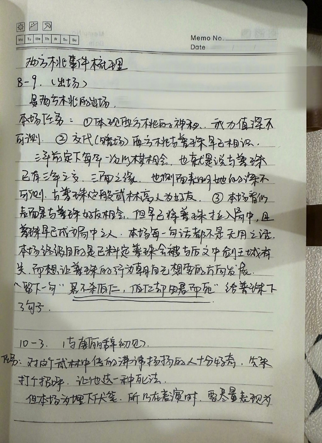 陈瑶水龙吟收官发文,好认真的西方桃像那种上课认真做笔记的学霸,详细记了需要增加的描写、表情、手势动作,还有事件梳理,不同情景的状态和任务,好真诚的瑶妹