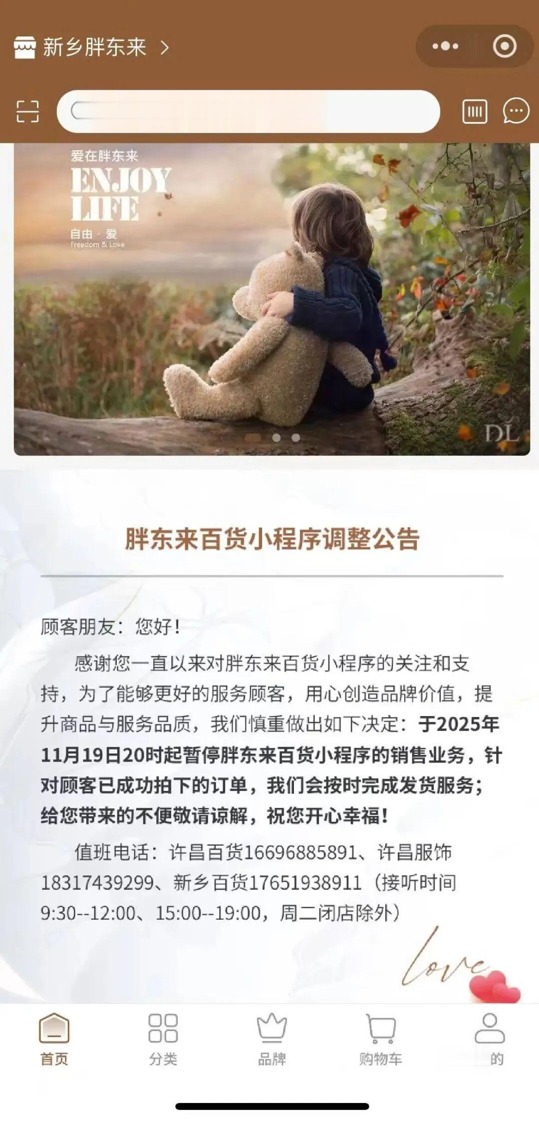近日,记者查询发现胖东来百货小程序发布了一则调整公告。这则公告中指出,为了能够更好服务顾客,用心创造品牌价值,提升商品与服务品质,公司慎重做出如下决定:于2025年11月19日20时起暂停胖东来百货小程序的销售业务,针对顾客已成功拍下的订单,会按时完成发货服务。