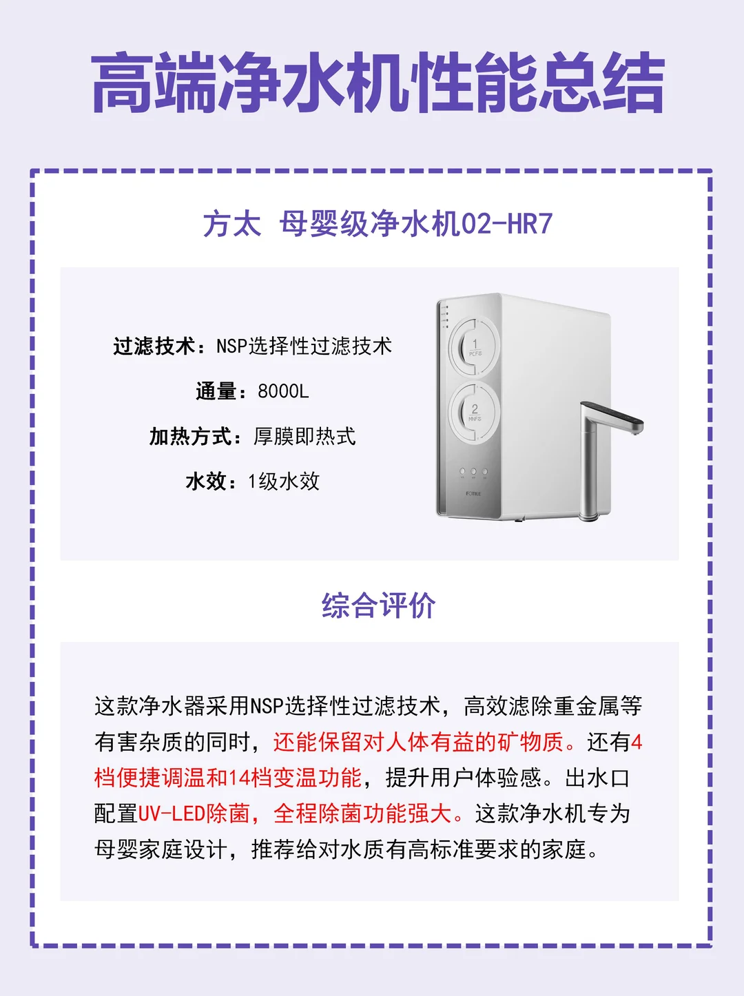 对比之后,方太母婴级净水机02-HR7可以完美的满足了我的需求。NSP选择性过滤技术真正做到了既干净又健康,滤出的每一滴水都是母婴级别的好水。触摸屏操作简单直观,老人也容易上手。还有有4档便捷调温、14档变温、5档热水水量可选,无论是冲奶、泡茶还是日常饮用,都能轻松满足需求。8000L的大通量,2L/min的出水速度,接水完全不用等,真的是贼拉方便!