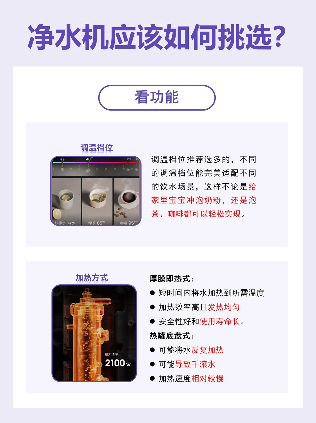 有宝宝的家庭,优先选有多档温度可调节的,比如 40℃、60℃等温度一键就能出,半夜起来冲奶不用手忙脚乱地调水温,简直是救星!