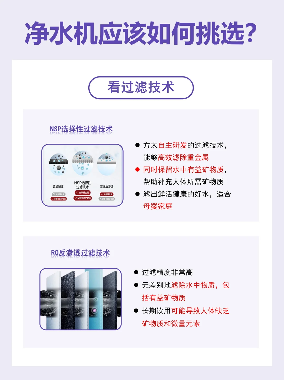 RO反渗透过滤技术:这种过滤技术过滤得超精细,啥都能给你拦住,基本出来的就是什么都不含的纯净水,但有个缺点,它把水里对咱身体好的矿物质也无差别的过滤掉了。所以我更推荐NSP选择性过滤技术,不仅可以高效滤除水中的重金属等杂质,还能保留水中的有益矿物质,滤出健康鲜活的矿物好水,帮助补充人体所需的矿物质。