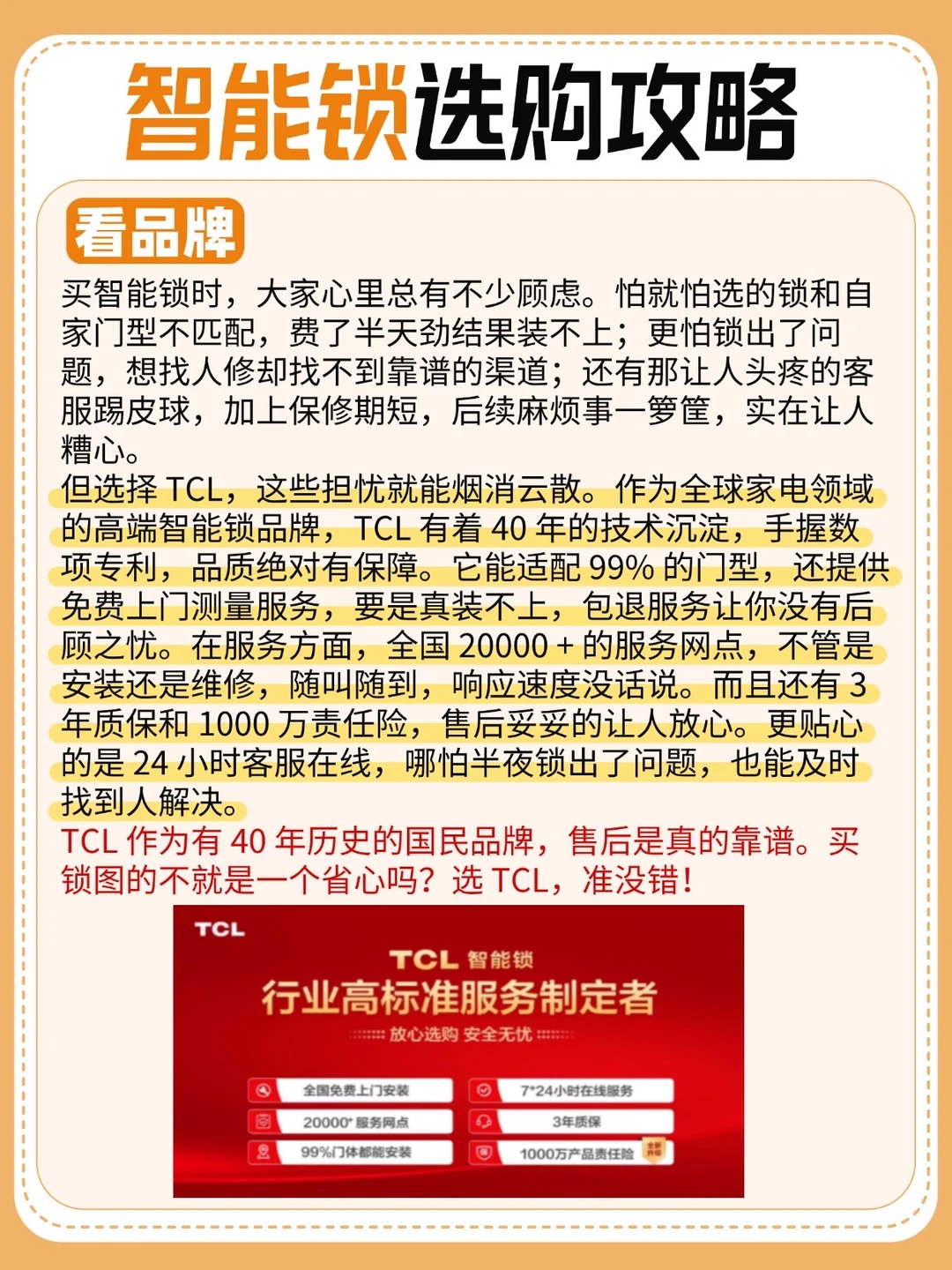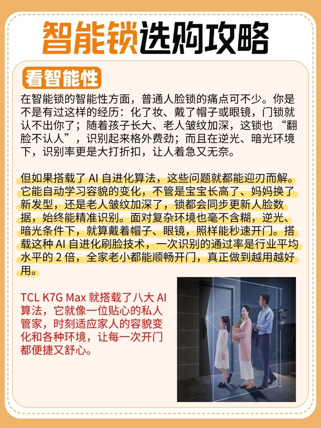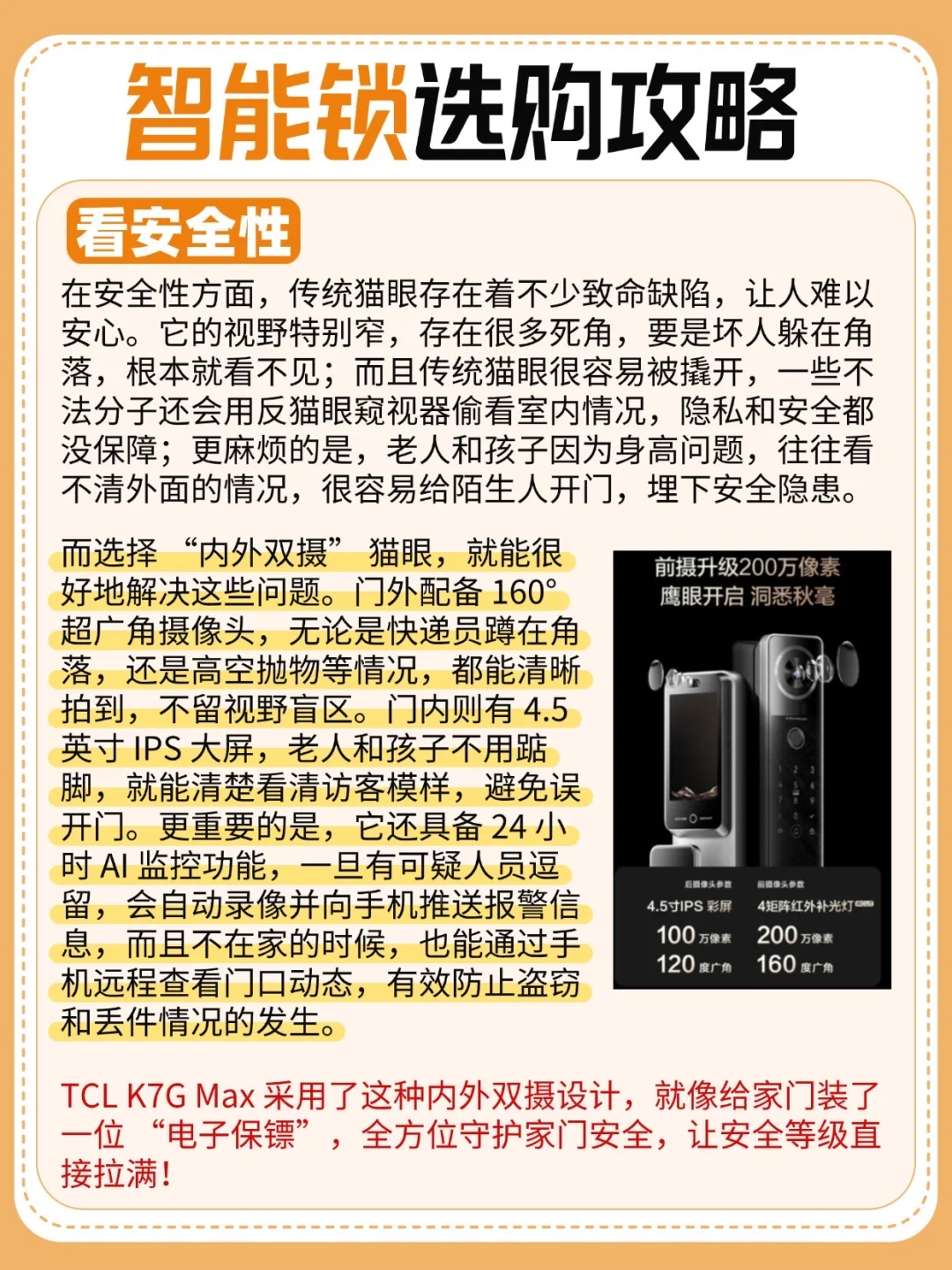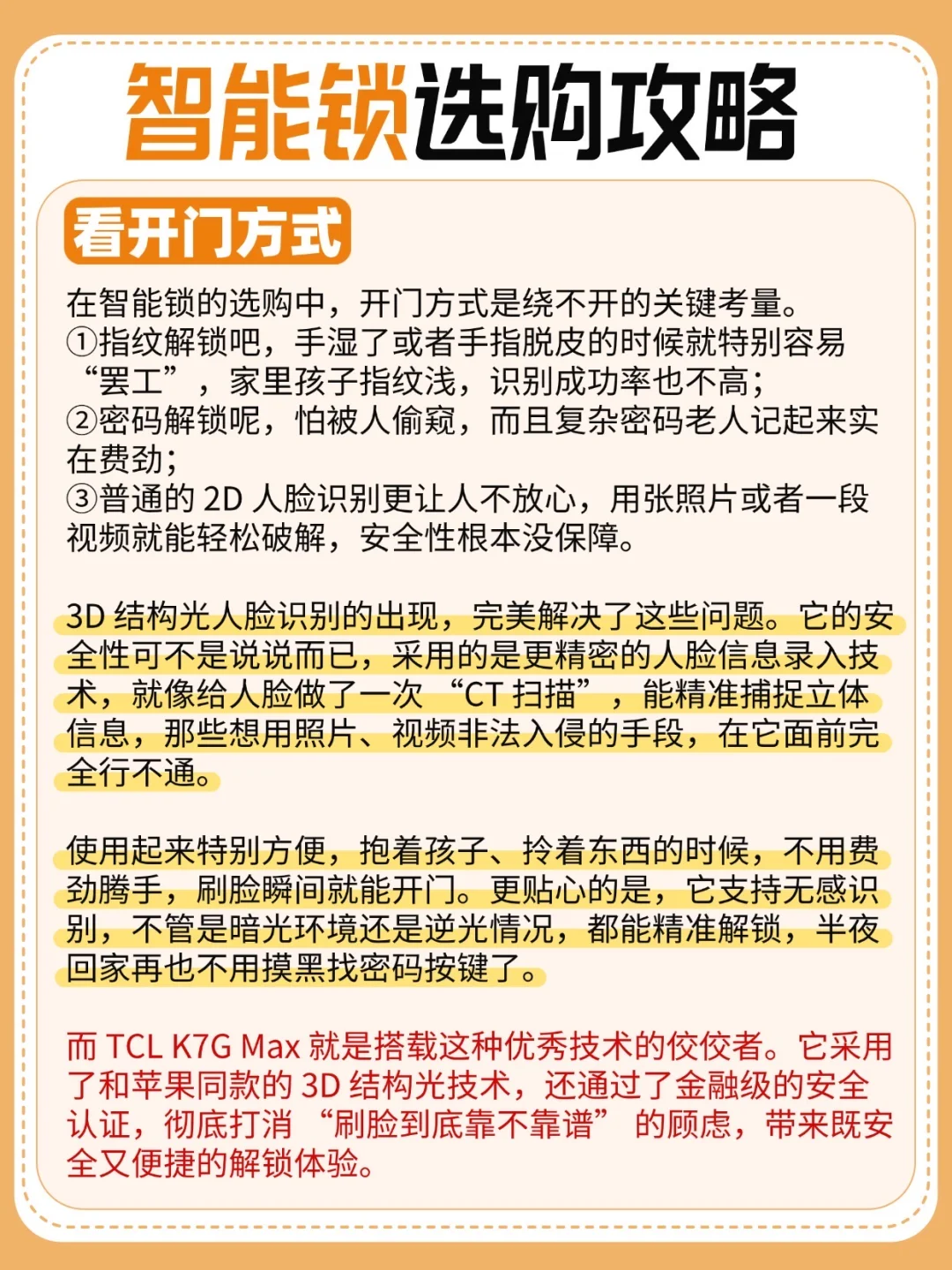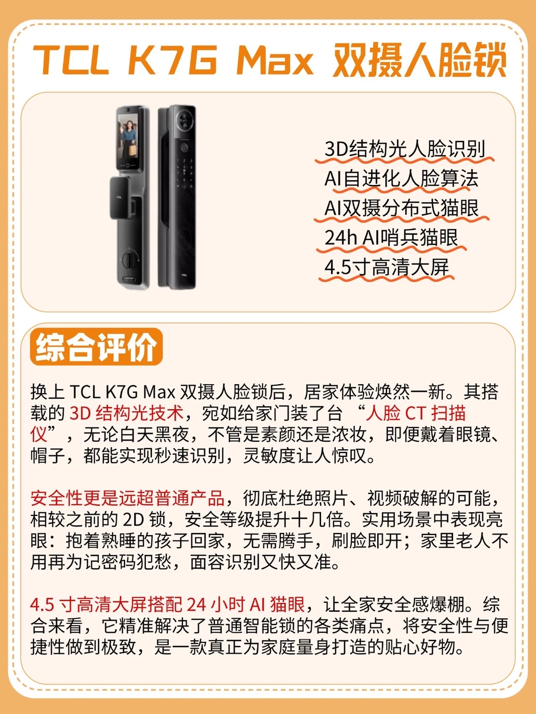之前用普通智能锁真的踩了太多坑:手指湿一点指纹就失灵,老人总记不住密码,带娃回家腾不出手掏钥匙别提多狼狈了… 直到换了这款,才知道什么叫 “智能锁的正确打开方式”! 👉🏻3D 结构光人脸识别太绝了 就像给家门装了 “人脸 CT 扫描仪”,白天黑夜、素颜浓妆、戴帽子眼镜都能秒开!抱着娃、拎着大包小包回家,不用抬手直接刷脸进门,解放双手的快乐谁用谁知道~最安心的是,照片视频根本破解不了,比之前的 2D 锁安全不知道多少倍! 👉🏻AI 自进化算法超贴心 我家娃长得快、我总换发型,爸妈皱纹慢慢变深,它居然能自动更新人脸数据!不管怎么变,锁都能精准认出家人,老人小孩用着都顺畅,一次识别成功率比之前的锁高太多~ 👉🏻双摄猫眼 + 大屏安全感拉满 门外 160° 超广角摄像头,快递员蹲角落、楼道动静都看得清清楚楚!门内 4.5 寸大屏,老人小孩不用踮脚就能看清访客,24 小时 AI 监控还会自动报警,独居或带娃家庭真的太需要了! 👉🏻TCL 大品牌售后超省心 40 年国民品牌不是盖的,免费上门测量、99% 门型都能装,全国 2 万 + 网点随叫随到,3 年质保 + 24 小时客服,用着完全没顾虑~ 真心觉得,选智能锁就得选这种懂家庭需求的!TCL K7G Max 把安全和方便做到了极致,全家老小都夸我买得值~正在挑智能锁的姐妹,闭眼冲这款准没错!