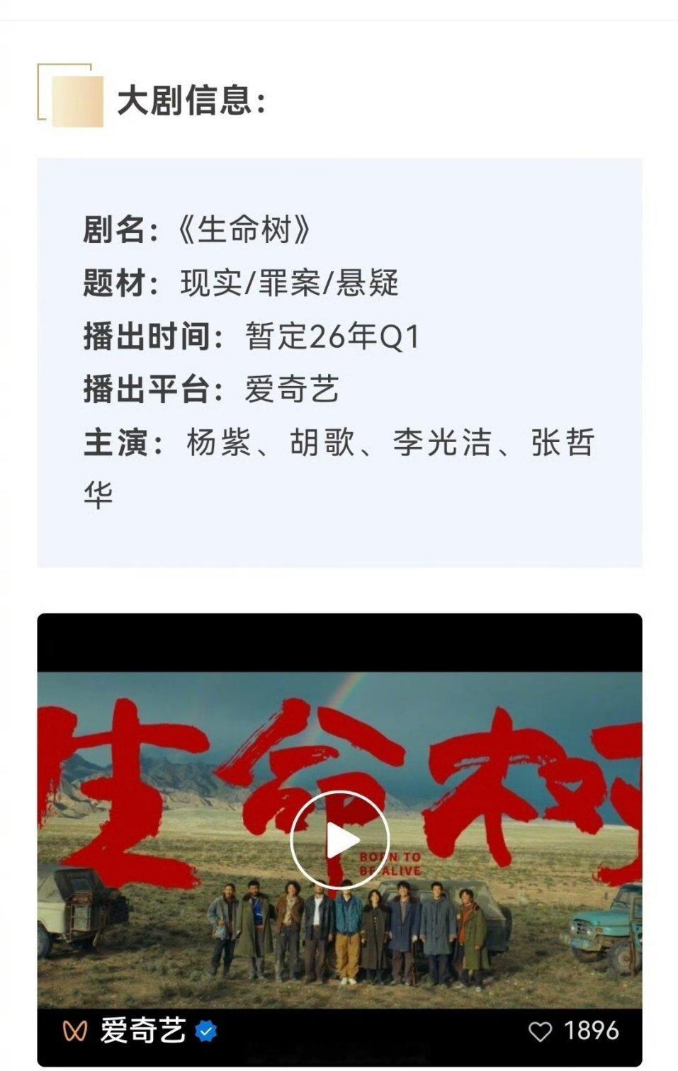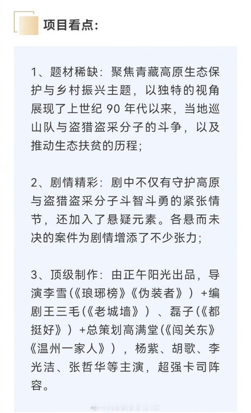 杨紫胡歌《生命树》招商来了,聚焦上世纪90年代乡村振兴与生态保护,与盗猎者斗智斗勇的故事,有消息说是央1开年档哦,期待一下