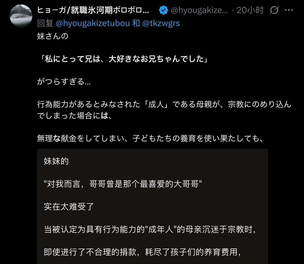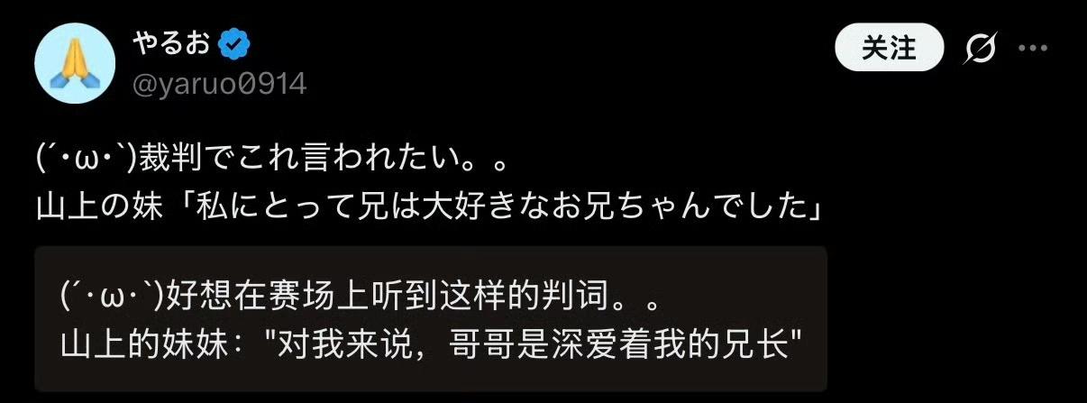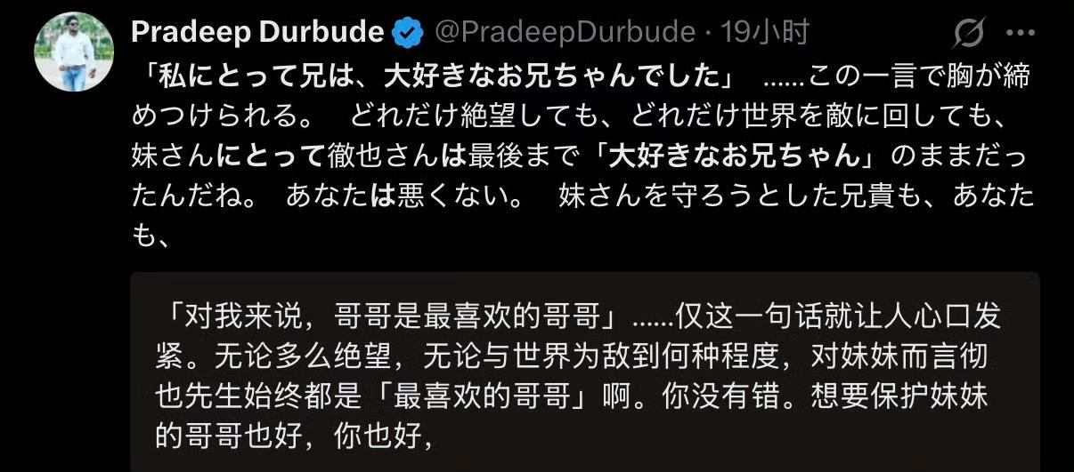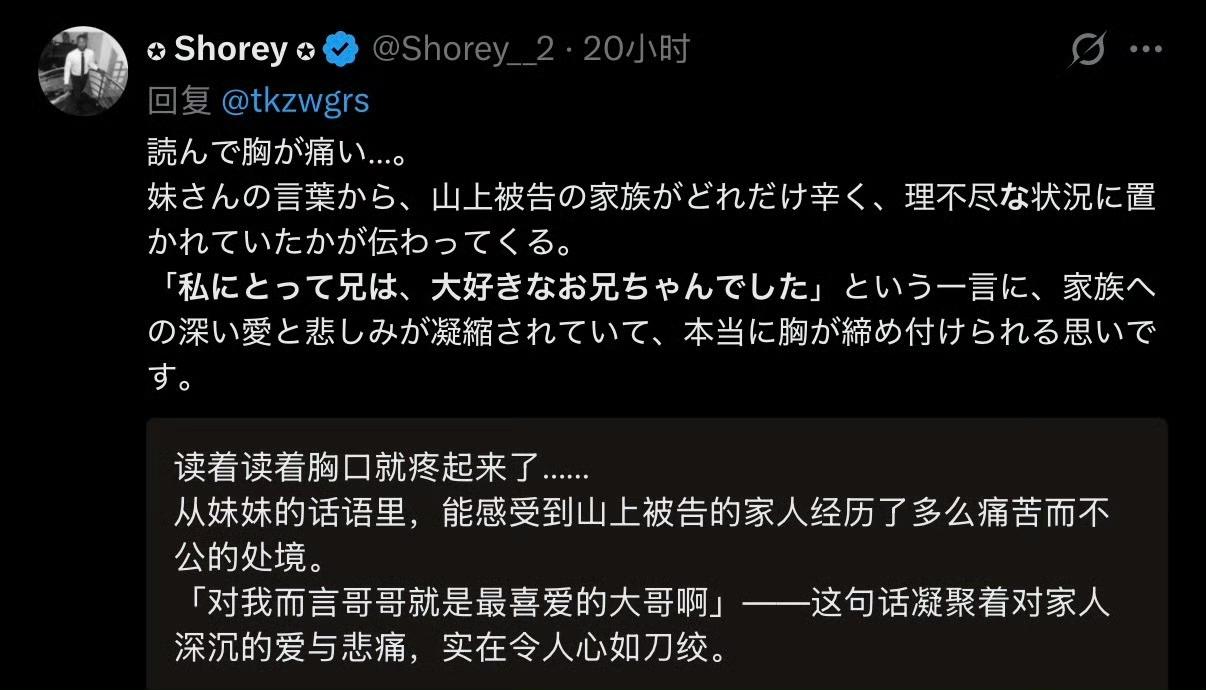日本检察官问:“你与山上被告是什么关系?” 山上彻也的妹妹本来应该的标准回答是:“兄妹关系”。 但是,山上彻也的妹妹说:“私にとって兄は、大好きなお兄ちゃんでした(对我来说,哥哥一直是我最爱的哥哥)”。 一下给日本人干破防了。