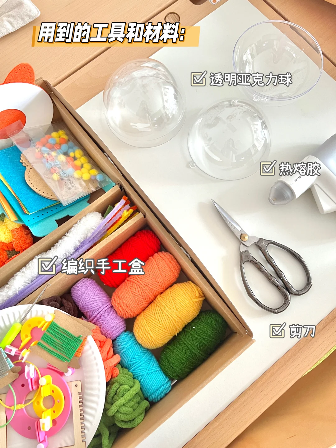 弥鹿奇趣编织魔法盒、透明亚克力球、电子灯、剪刀、热熔胶、卷纸筒…