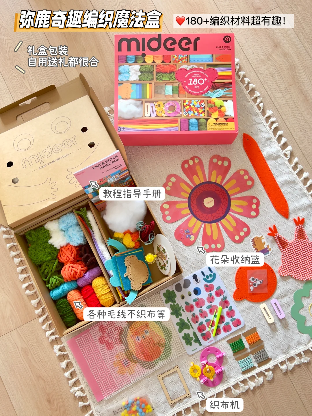 这次的手工材料大多来自【弥鹿奇趣编织魔法盒】180多件手工编织材料、毛线🧶、不织布、织布机、制球器、胶水等满满一大盒!