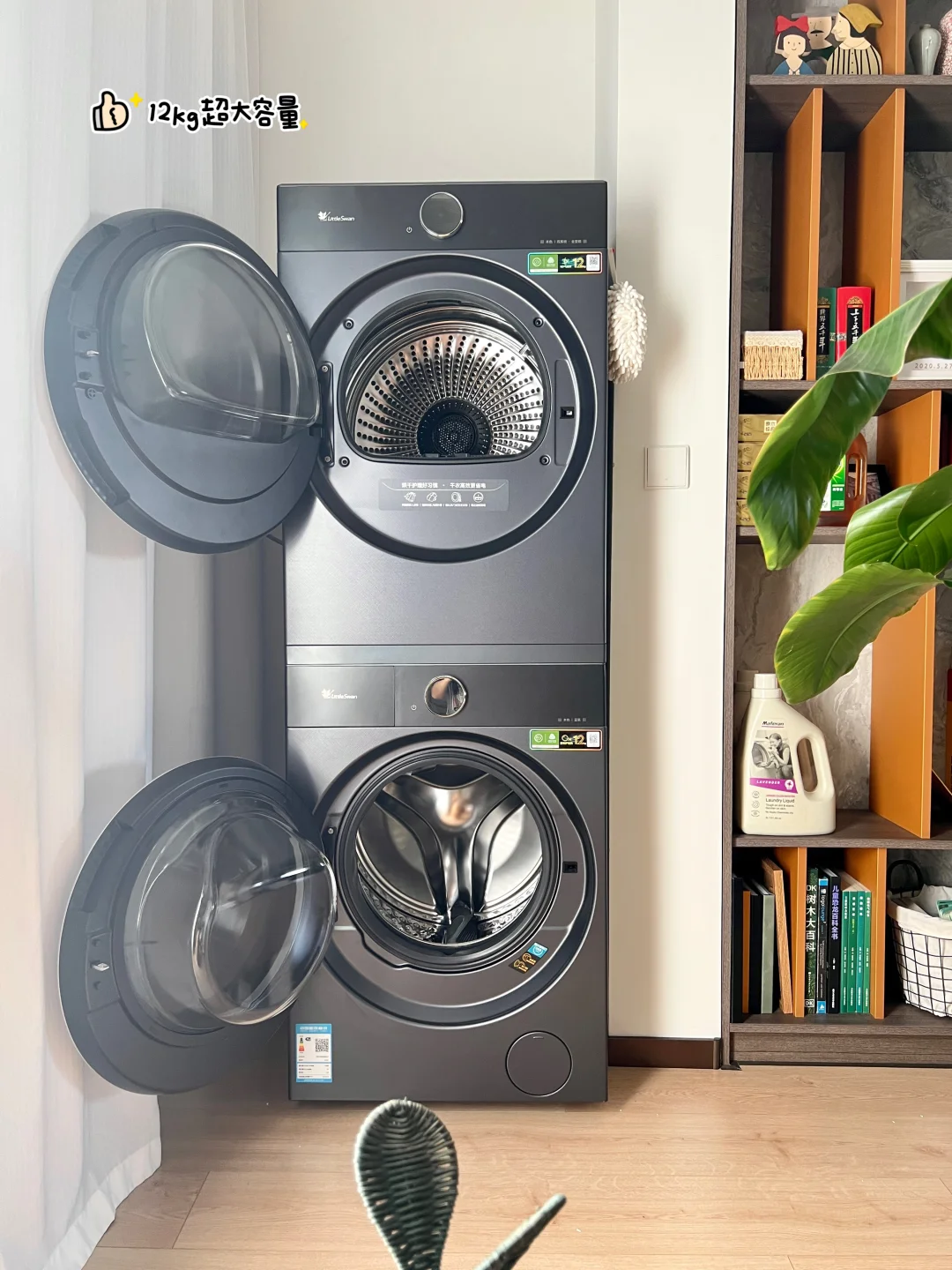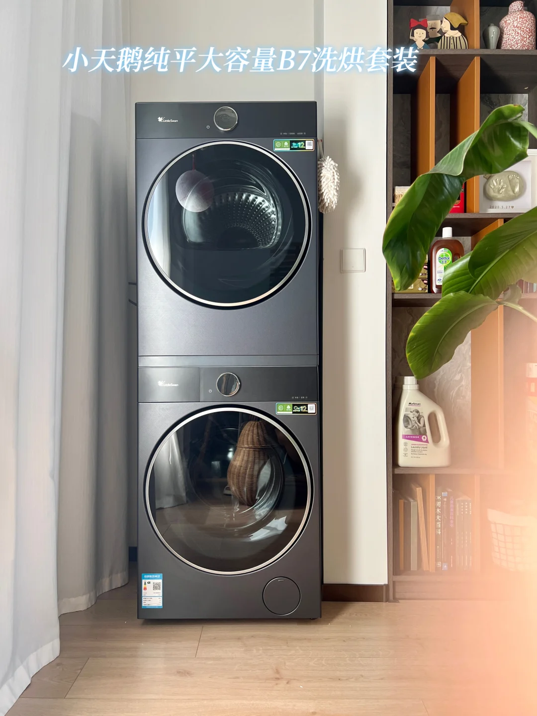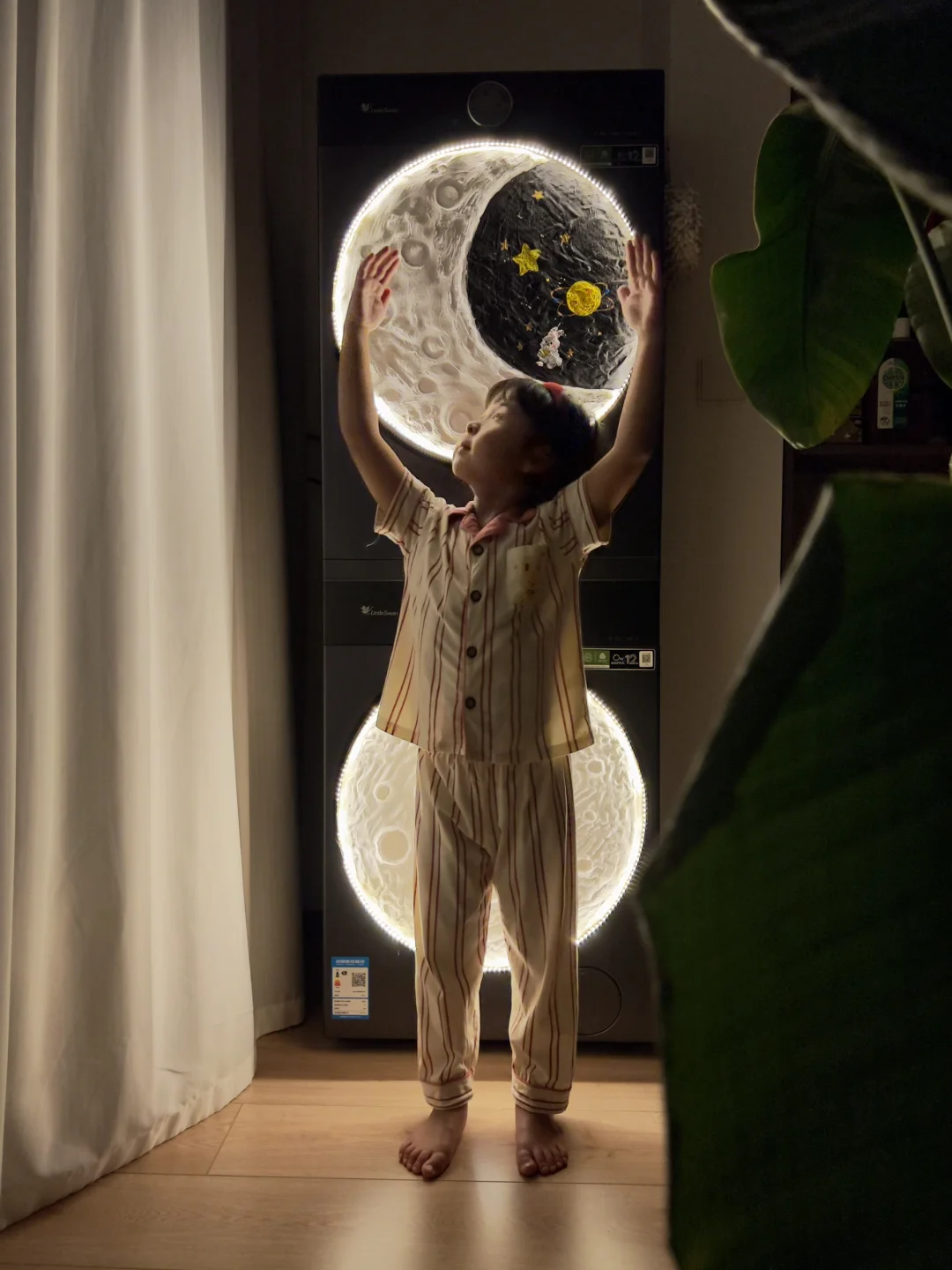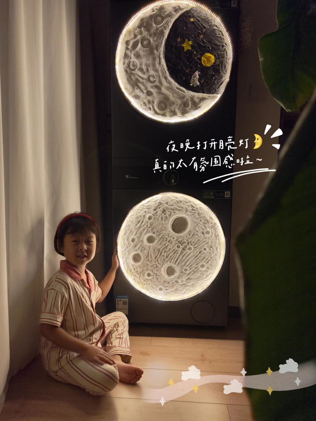 前些天用纸箱做的月饼🥮灯笼,大家简直太捧场了~ 做卫生的时候,盯着我家的洗烘套装这两个圆圆的舱门发了会儿呆…… 这不就是现成的、最大最圆的月亮🌕嘛!? 灵感说来就来,立马动手! 亮灯的那一刻,整个阳台都笼罩在温柔的中秋氛围里,仪式感直接拉满! 这个中秋,让洗衣机不只是洗衣机,更是团圆的氛围担当吧!祝大家月圆人团圆!✨