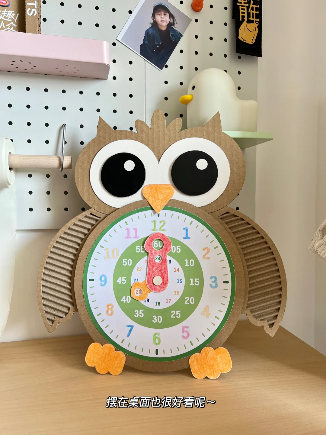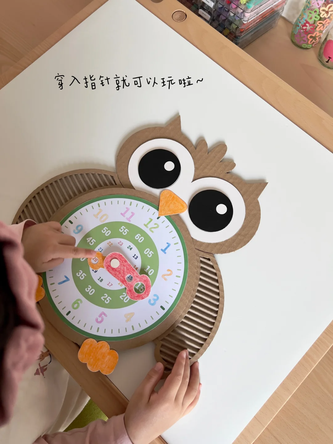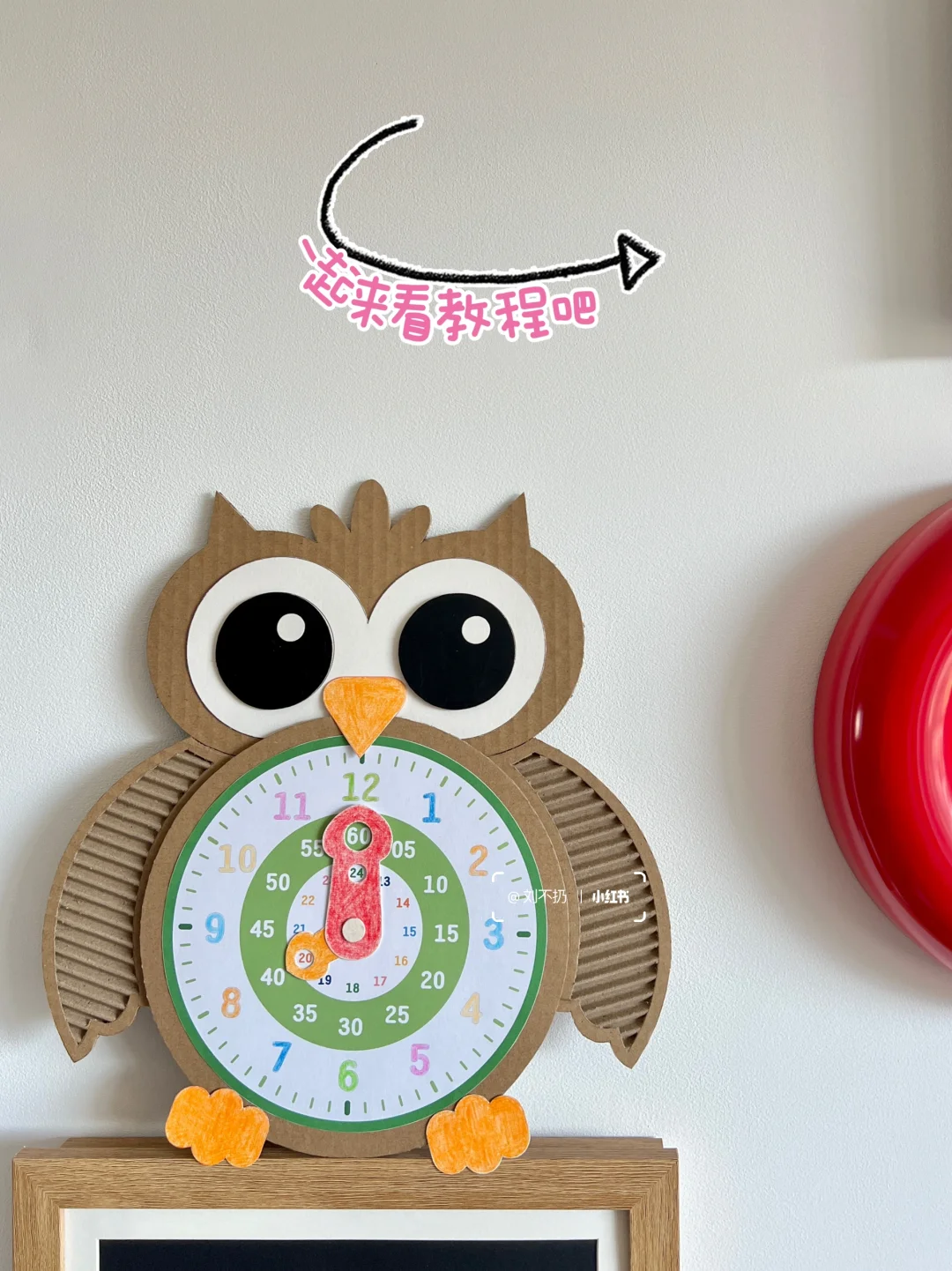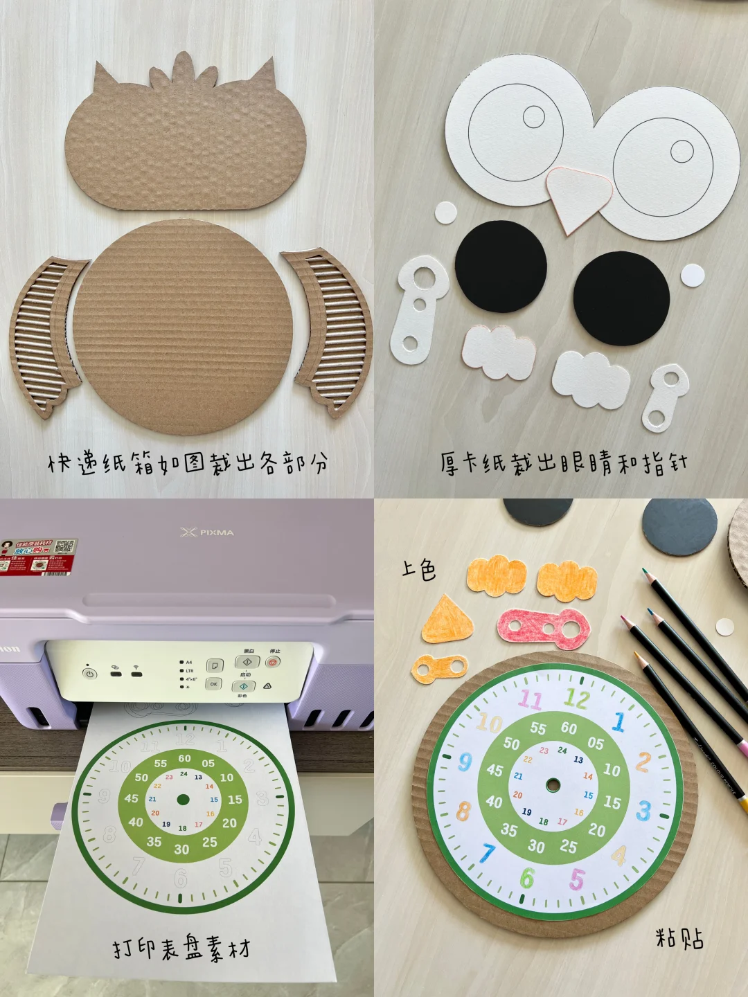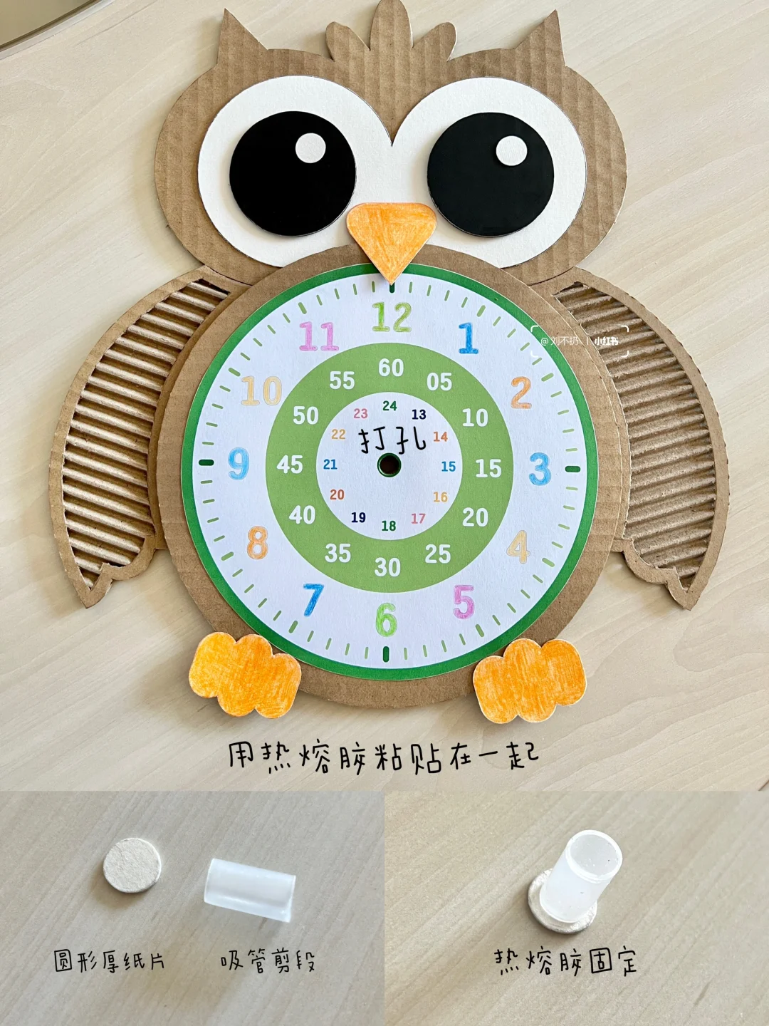 快递纸箱不要扔! 教你给娃改造猫头鹰钟表玩教具🕙 用到的材料:快递纸箱、美工刀、热熔胶、彩笔、吸管…… 按照图示教程拼贴就可以啦~ 表盘素材可直接打印