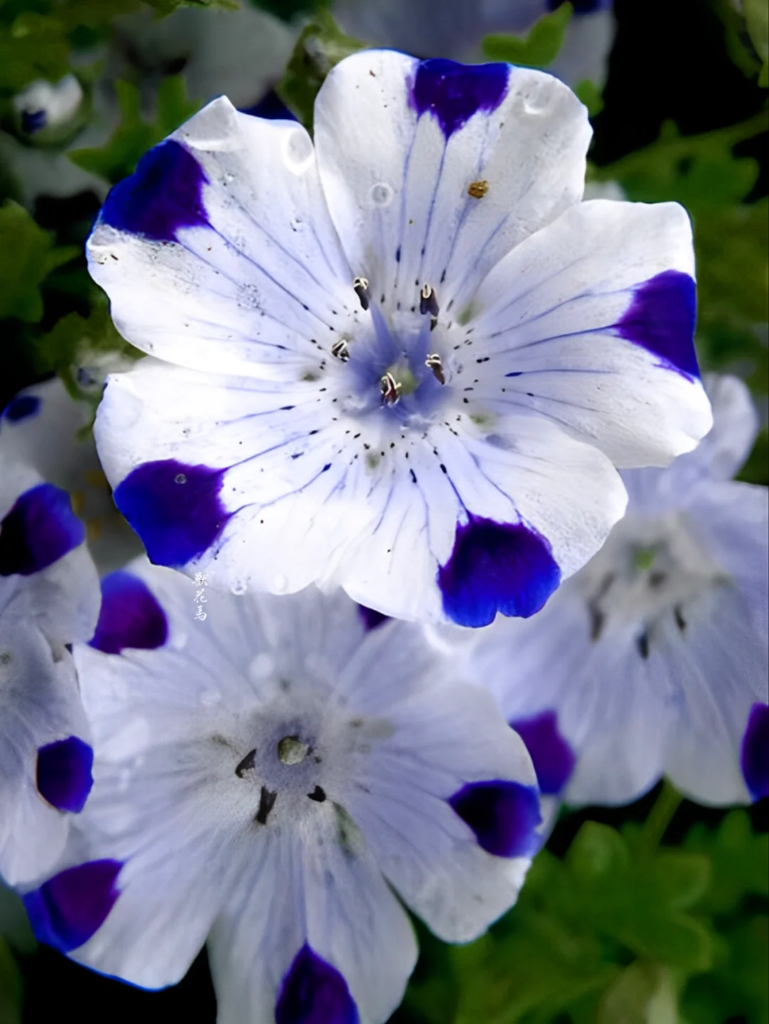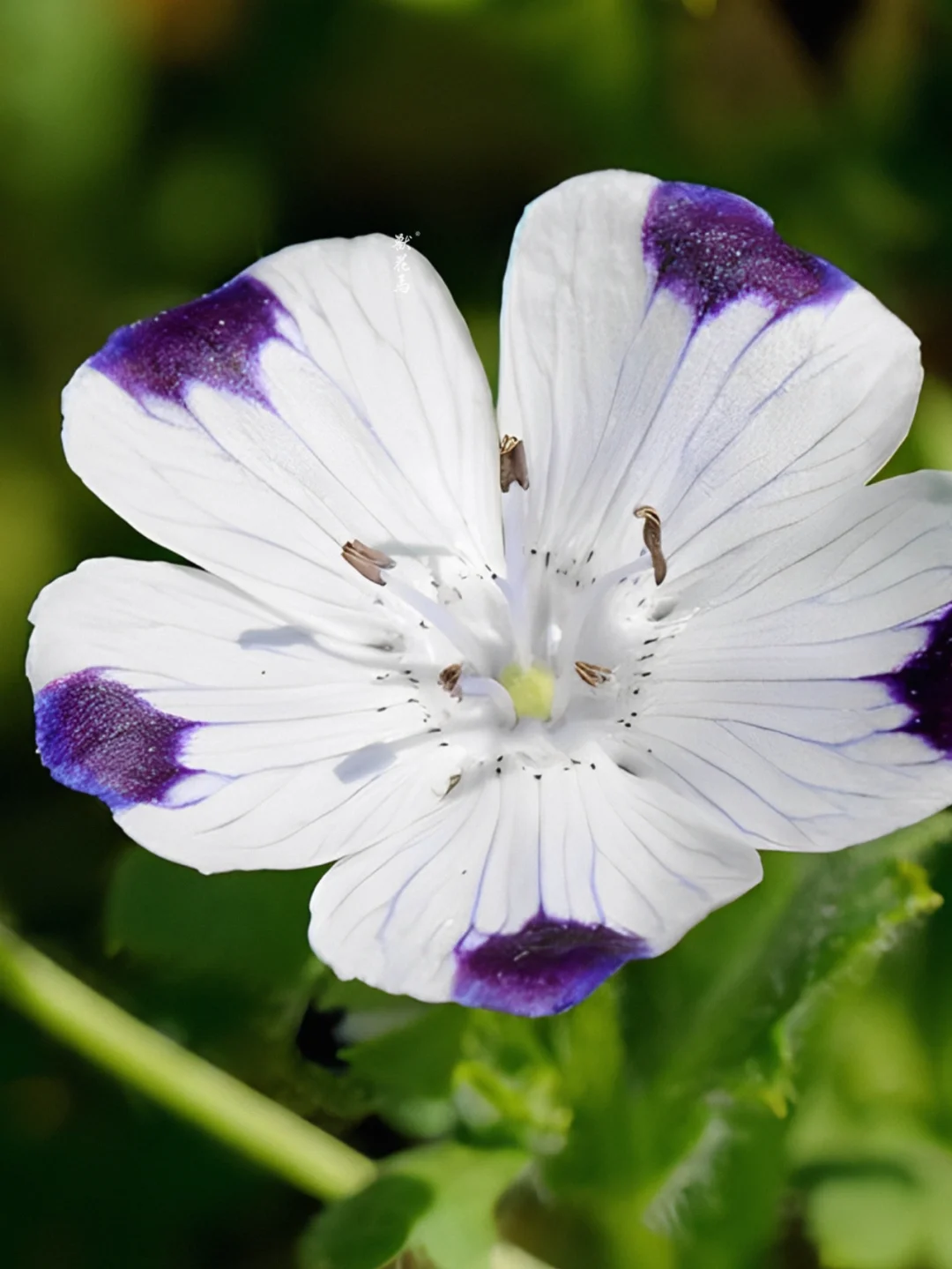 ✨5片花瓣纯白底色,每瓣尖自带一枚深紫色圆斑,像被星星吻过✨