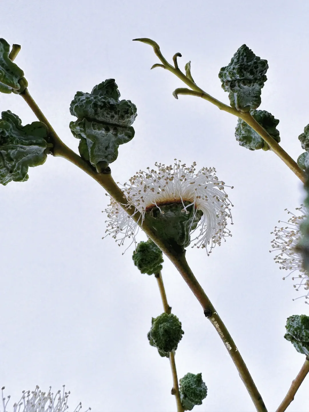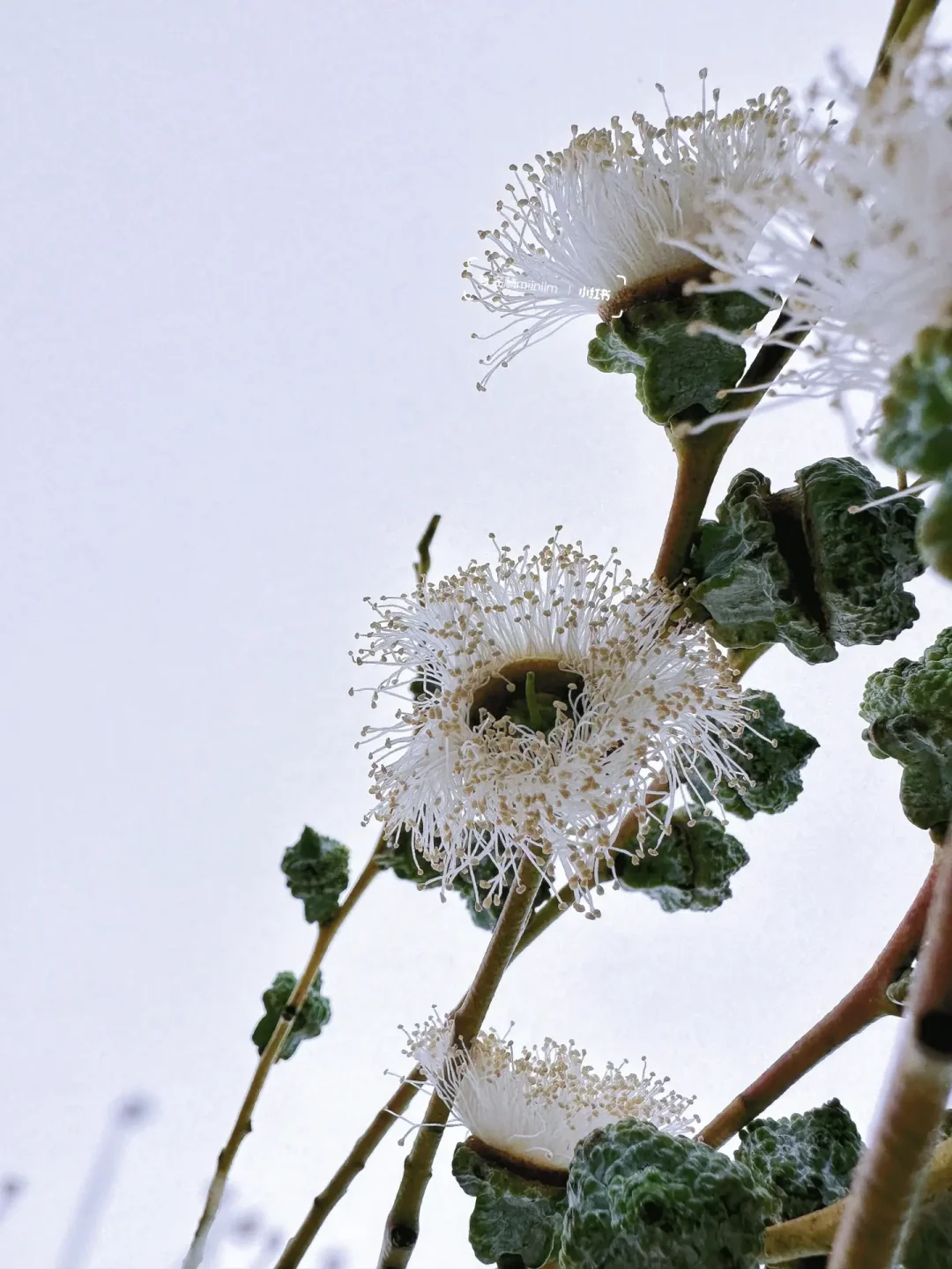 尤加利果带有天然的霜蓝色,自带清冷感,而它们其实不是果子,而是花芽,到了成熟的时候,它会打开上面的盖子,从里面开出白色丝状的花。花丝开几天以后便会脱落,然后整株就可以做为干花来养护,但不是所有的“果”都会开放,也要看季节和果的成熟度。