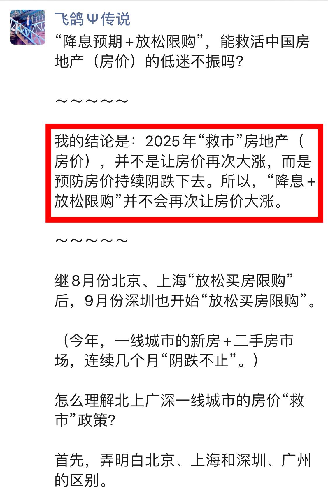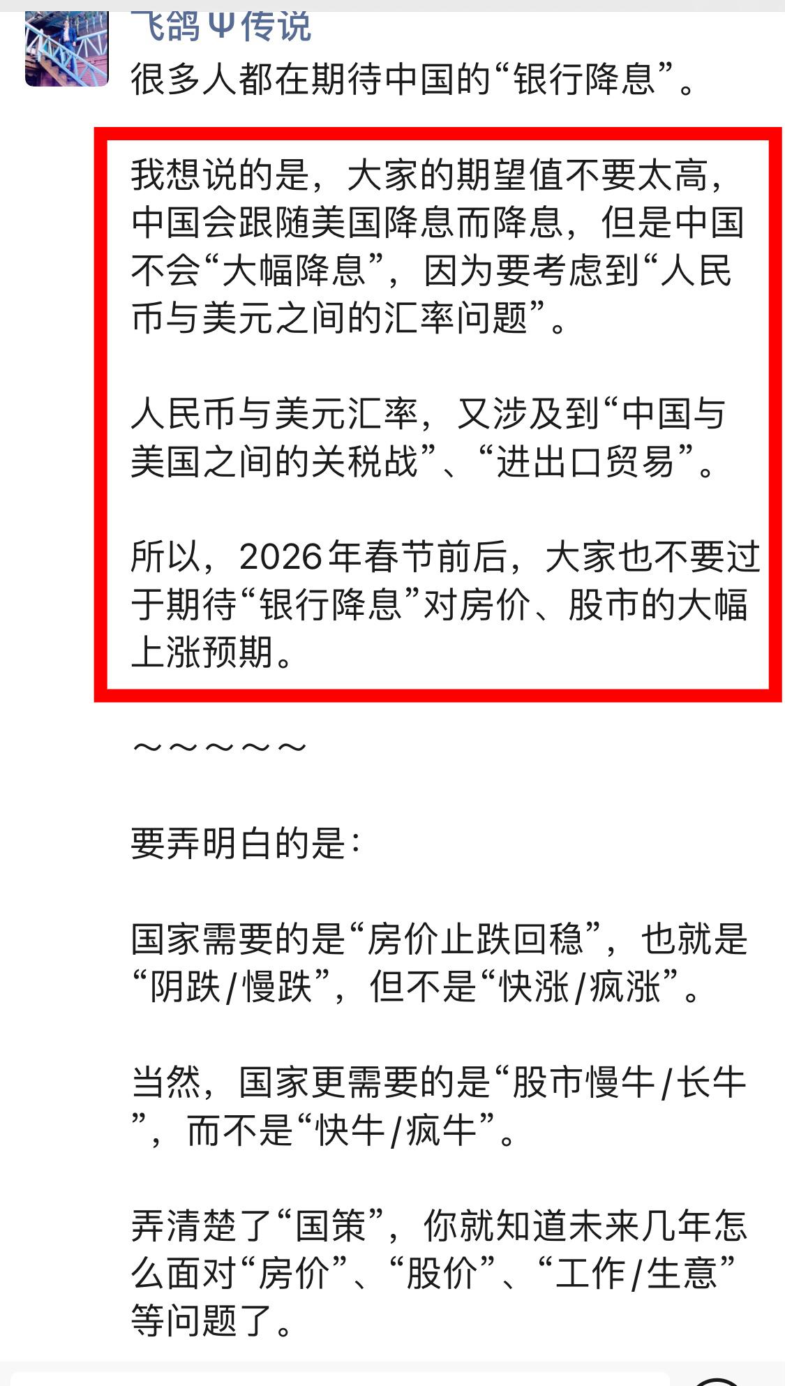 11月份,我国“不降息” ~~~~~ 11月20日,最新LPR报价出炉。 11月LPR报价依然不变,维持了5月以来的利率水平: 5年期以上LPR为3.5%,上月为3.5%; 1年期LPR为3%,上月为3%。 (符合我的预判观点。) ~~~~~ 美国“降息预期”下降,我国“降息预期”自然也会下降。 ~~~~~ 不降息: 对我国的房价市场“不利”; 对我国的股票市场“不利”; 对我国的银行体系“有利”。 1、股市 无数散户股民还在幻想“上证指数年底再攻4000点的赚钱效应”。 (10月中旬,我就发表观点,忠告建议大家“减仓或空仓”了。) 当然,我相信没有几个散户股民“会听进去”的。那么,散户股民很可能将面临“亏损”的心理博弈。 2、楼市 央行“不降息”,房贷利率水平自然也是保持不变。 那么,对于买房/炒房的持房人来说,却是“成本”。 “房价上涨”更是奢望。 (前几日,我国公布的10月份房地产市场数据,继续下跌态势,低迷不振。) 虽然银行可能新出台“新房”政策——贷款补贴,但是对买房人来说,根本解决不了实际问题。 (房价下跌,意味着影响着大部分家庭的收入水平,家庭收入很大可能也是下降的。收入下降,怎么再去贷款买房/频繁高消费呢?) 或许,很多人会有疑问: 2020~2021年,甚至十年前,大家为什么敢于“贷款买房/炒房+大吃大喝大买”? 因为那时候大家想的是“房价只涨不跌”的未来预期,就算大家的工资收入不高,大家也敢于去“透支未来的钱”。 但是,一旦房价上涨预期“大逆转”,收入预期也会发生“大逆转”,大家就不敢“透支未来的钱”。 这就是2022~2025年我国经济从“通胀风险”转向“通缩风险”的真实写照。 (大家不敢“投资+消费”,是因为“收入预期”的不确定性因素加强了,“降薪/被裁员/失业”的人越来越多了。) 美联储降不降息 中国降息 ~~~~~ ——飞鸽说 2025.11.20