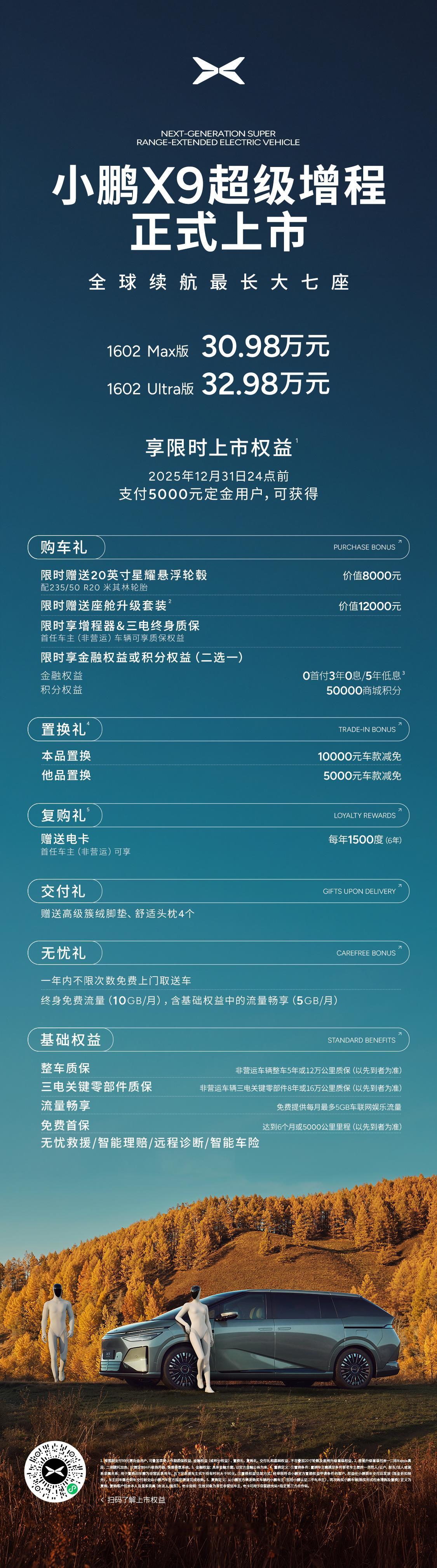 小鹏X9增程起售价30.98万元(原纯电版35万),Ultra版32.98万元,新车综合续航1602km,纯电续航452km,搭载800V、5C超充技术,标配第二代VLA小鹏这样产品里猛拉,价格向下,估计后台订单会很不错