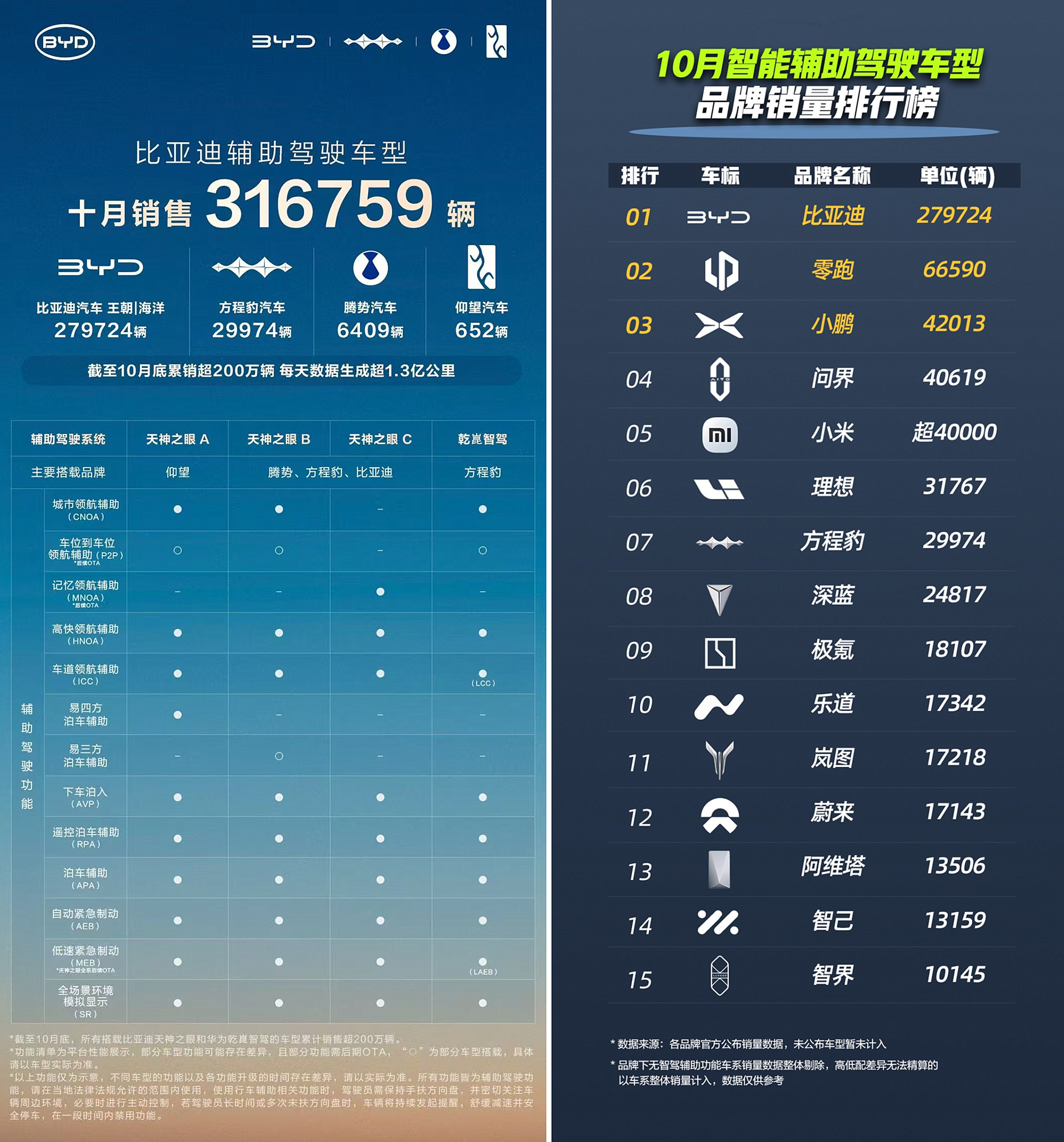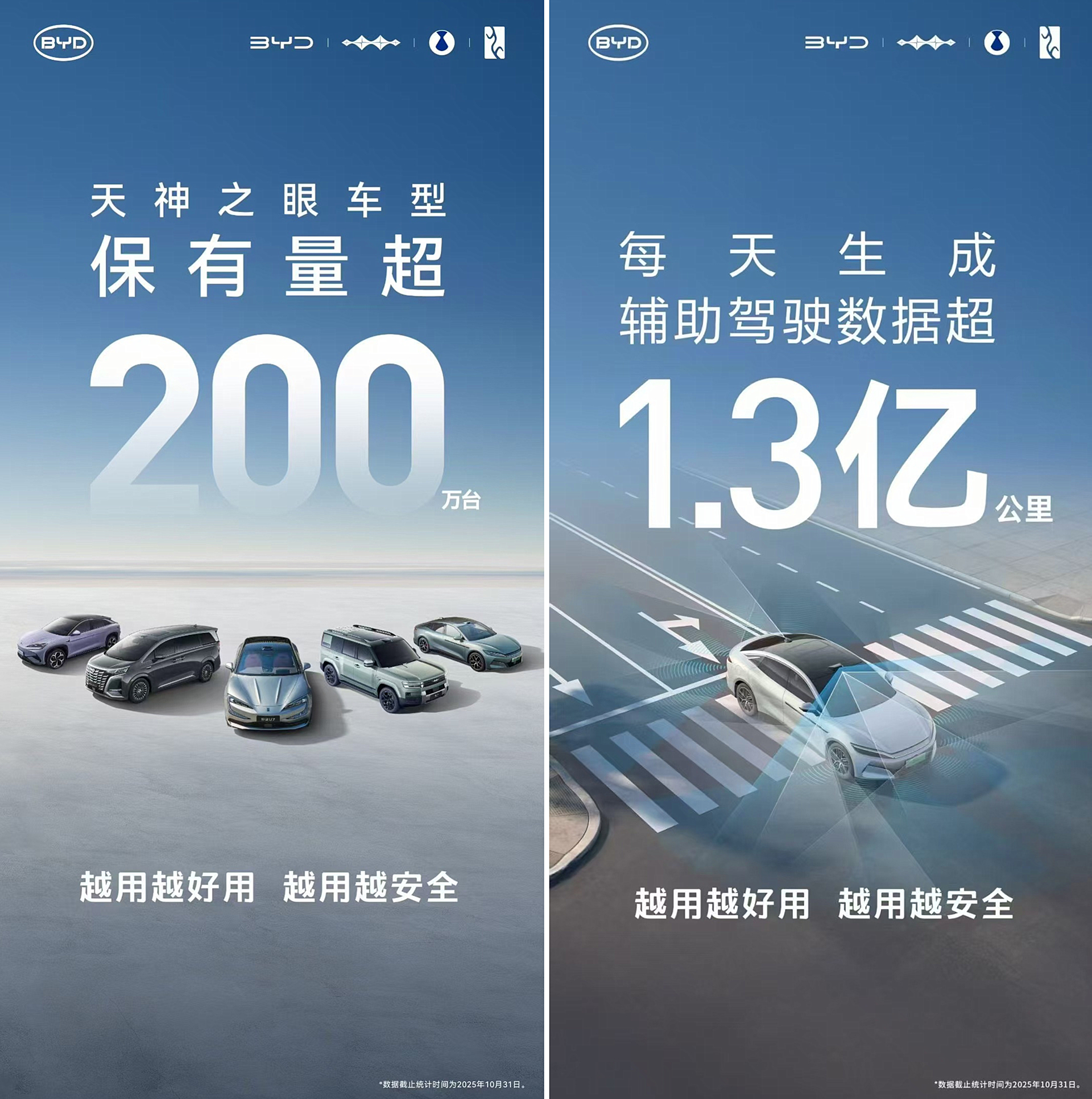 值得注意的是,在销量创下新高的同时,比亚迪智驾销量突破新纪录!截至10月底,搭载“天神之眼”辅助驾驶系统的车型累计销量已突破200万辆,日均生成的智能驾驶数据里程更是超过了1.3亿公里。要知道,这可是比亚迪于今年年初才发布的辅助驾驶系统,如此之快的增长速度,堪称行业奇迹。