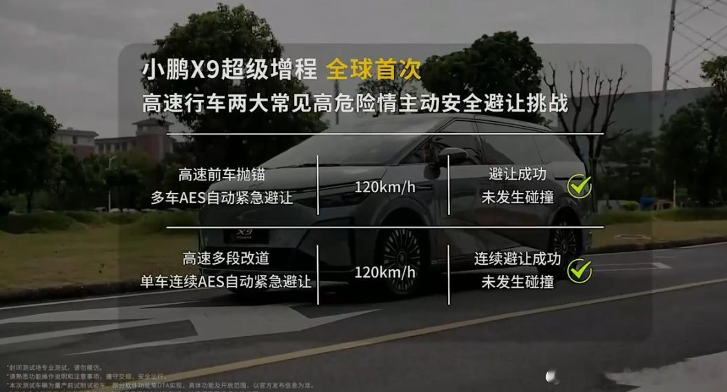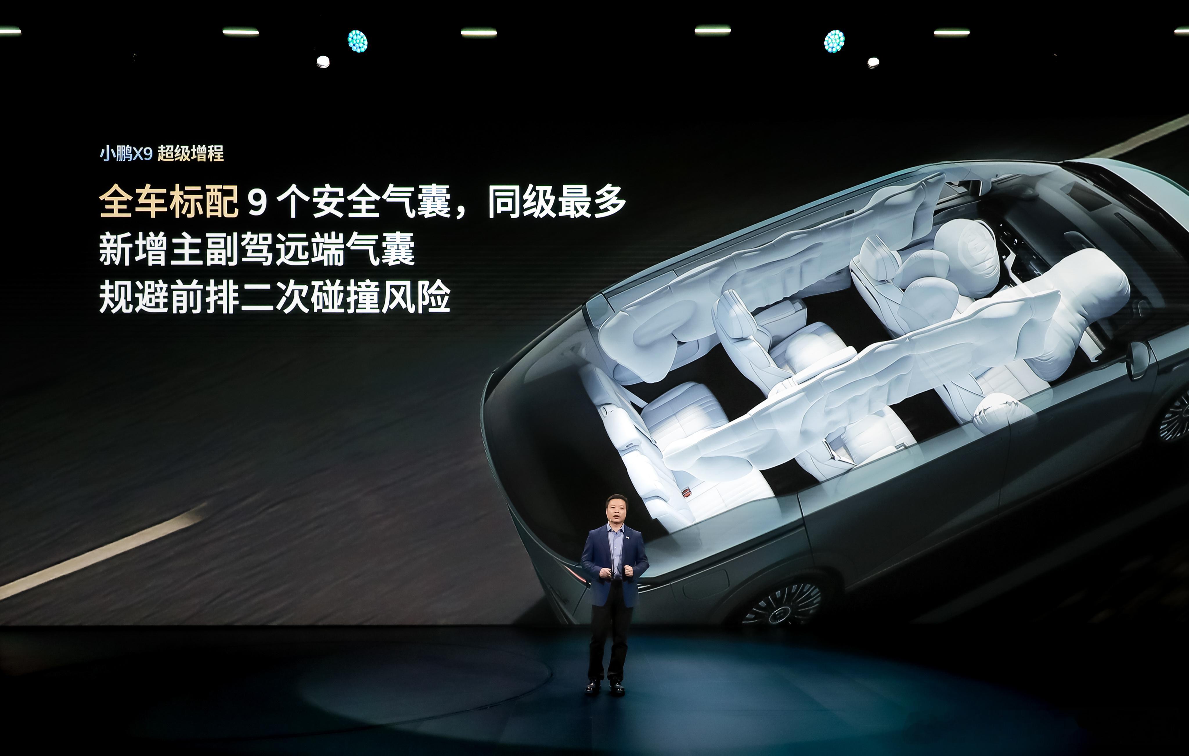 小鹏X9最大的亮点是什么?除了1602kmCLTC综合续航全球第一,纯电425km,综合油耗WLTP百公里仅仅2.53L的极致能耗就是安全,安全,还是安全!高强度车身,26版最高欧标全五星,超大8892立方厘米吸能盒。9个安全气囊,除了新增主副驾远端气囊,配备了零重力座椅专属安全气囊,发生碰撞时可以快速弹出,防止二排乘客顺着座椅向前滑动,让家人在长途休憩时也能获得充分安全保障。极限工况+7人满载全车总重达3.324吨,通过最严苛的爆胎测试:✅160km/h 积水路面爆胎 ✅150km/h 暴雨天气爆胎 ✅150km/h 同侧双轮爆胎!!✅120km/h 模拟冰面爆胎 !!✅90km/h 高速绕圆爆胎 ✅60km/h 雨天下山急弯爆胎 !!电视防夹手,行业首例电容集成铰链方案!主动安全AEB/AES高达130km/h冰雪路面,同样丝毫不慌:✅离地最高185mm防止托底✅10cm雪坑后轮脱困✅防侧滑冰雪稳行系统26年国标,电芯24小时不起火,不爆炸。2000J最高标准电池防冲击标准