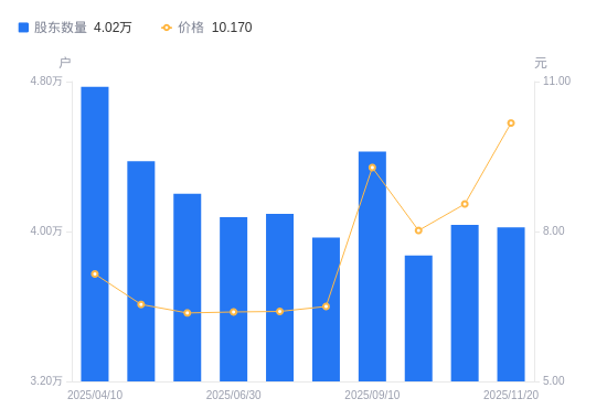 日期A股户数(户)流通A股户均持股数(股)户均持股市值(万元)2025-11-204022542186.0342.902025-10-314035542050.1335.952025-09-303872243823.4935.152025-09-104426538335.7735.582025-07-313968242763.2927.802025-07-184093841451.2926.532025-06-304077141621.0826.602025-05-304201640387.7825.732025-04-184374738789.7025.372025-04-104772235558.7225.42