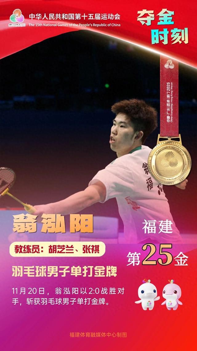 欣闻我省运动员翁泓阳在第十五届全国运动会羽毛球男子单打项目比赛中,不畏强手,勇夺金牌。在此,省委、省政府向你们及翁泓阳同志表示最热烈的祝贺,向我省全体运动员、教练员和工作人员表示亲切的慰问!希望我省参赛运动员向翁泓阳同志学习,发扬敢为人先、爱拼会赢的开拓创新精神,团结一心,奋勇争先,在本届全运会上夺取更加优异的成绩!