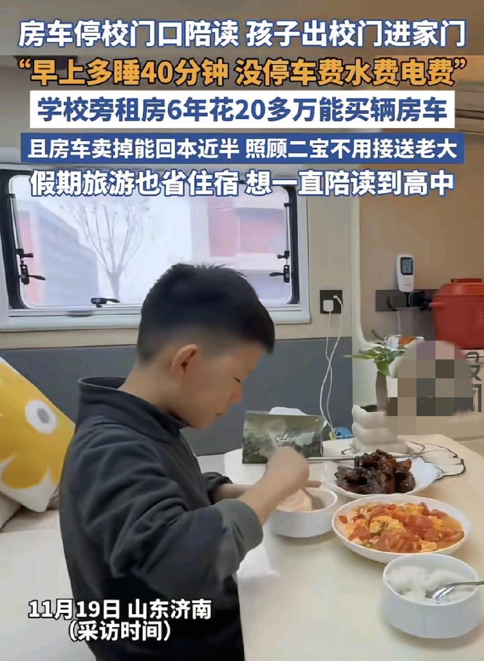 山东济南一位妈妈陪伴孩子读书,买了一辆房车开在学校门口不远处,每天还是可以多睡40分钟,既照顾了二宝,又陪伴着大宝读书,因为在学校附近租房子3000多块钱一个月,6年下来都可以买一辆房车了,而这辆房车6年之后卖出去还赚回部分钱,平时节假日还可以开着房车到处去旅游,妈妈是用心良苦,可很多家长觉得,房子的学习条件可不是房车能比的。
