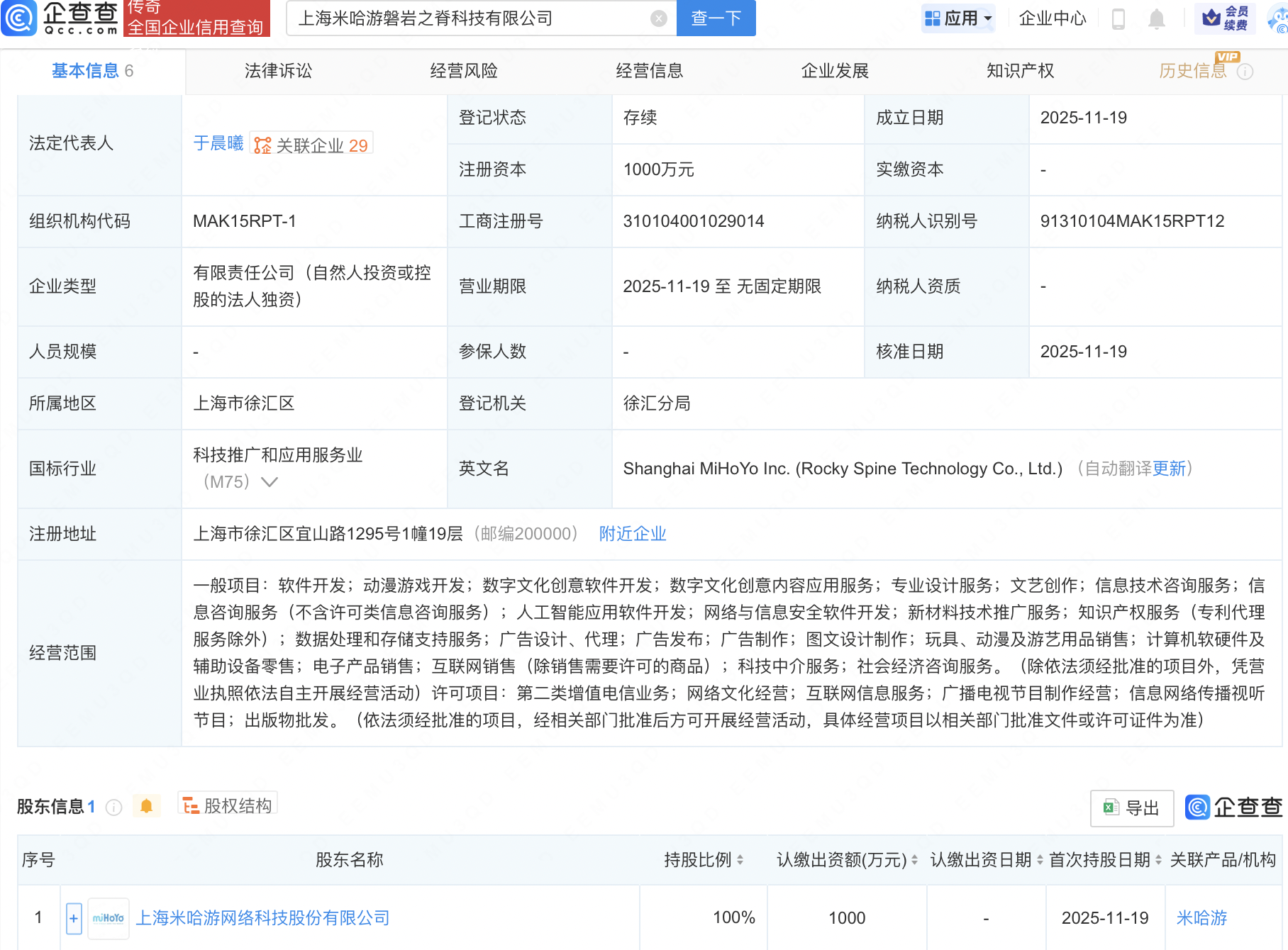 企查查APP显示,近日,上海米哈游喧哗尘世科技有限公司、上海米哈游磐岩之脊科技有限公司成立,注册资本均为1000万元,经营范围均包含:数字文化创意软件开发;数字文化创意内容应用服务;互联网信息服务;网络文化经营等。企查查股权穿透显示,二者皆由上海米哈游网络科技股份有限公司全资持股。
