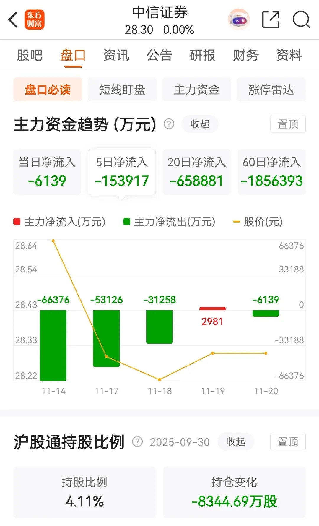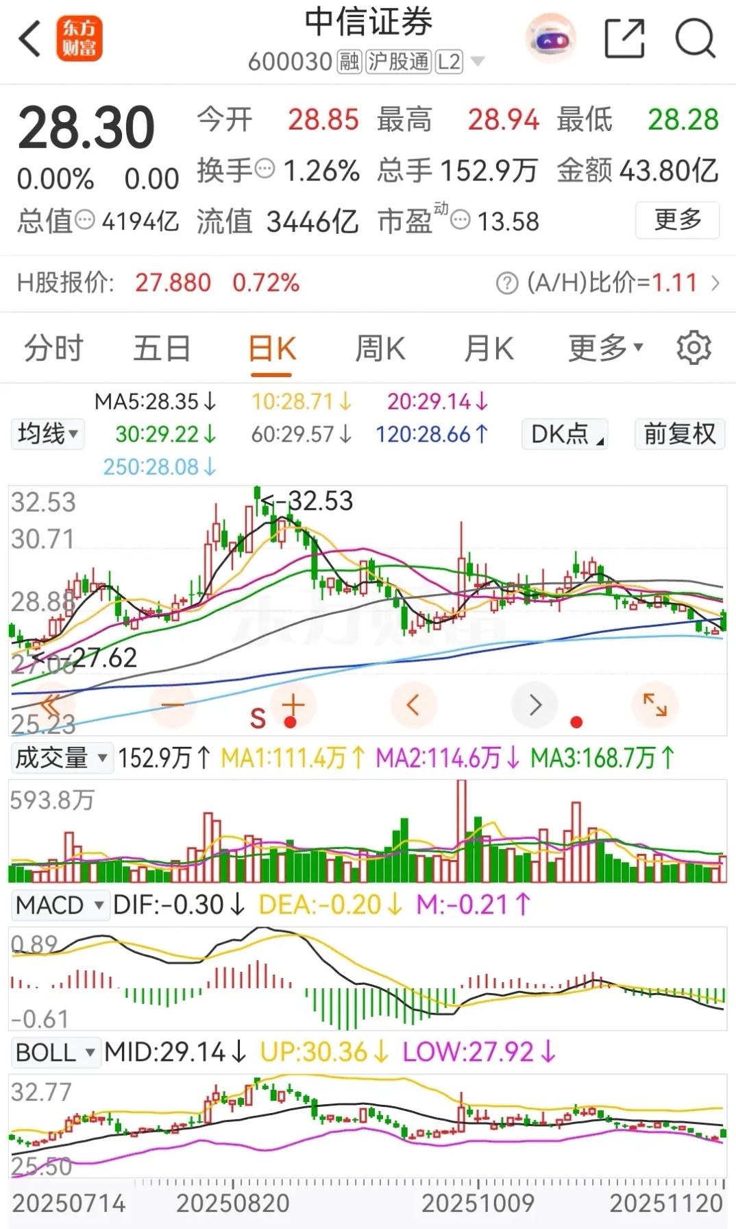 东方财富高开低走,连续五天下跌,连续五天被主力资金净卖出,今天的下跌幅度为 1.07%;而中信证券则是高开低走,平盘报收。东方财富今天的走势是高开低走,尾盘加速下挫,收盘时下跌了1.07%,报价为24.07元。在资金流向上,连续五天被主力资金净卖出,今天的净卖出金额为3.9182亿元,而近五个交易日则是合计净卖出了约 22.9073亿元。从走势上看,今天再次创出本轮调整新低,股价已经跌到了年线处,日线级别走势处于破位状态,周线则是四连阴,跌到了60周线处,而月线则是三连阴,已经跌到了10月线处。中信证券今天同样也是高开低走,但却以平盘报收,当前报价为28.3元。在资金流向上,今天被主力资金净卖出了约0.6139亿元,近五个交易日则是合计净卖出了 15.3917亿元。技术面走势基本上同东方财富一致,这里就不再详细说了,想要了解更多,可以查阅上一篇中关于券商概念板块今天走势的分析。对于二者的后续走势,有乐观的投资者者认为,券商板块处于估值低位,证券板块的PB正处于历史中低位(1.3倍),年内涨幅显著跑输大盘,存在着补涨空间。谨慎投资者则认为,券商被量能制约,今天沪深成交额虽达1.7万亿,但板块内部分化明显,资金承接力度不足;另外就是券商的工具属性,目前证券板块长期被压制,充当“慢牛控速器”,与业绩(三季报预增87%)严重背离。部分投资者称其为“渣男板块”,高开低走概率大。