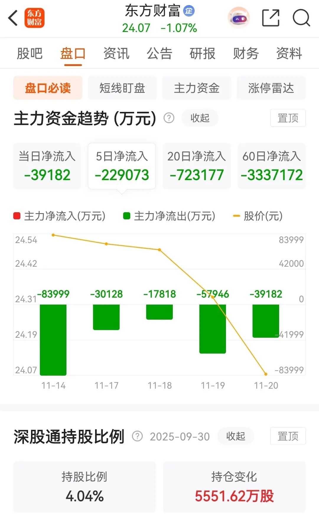 东方财富高开低走,连续五天下跌,连续五天被主力资金净卖出,今天的下跌幅度为 1.