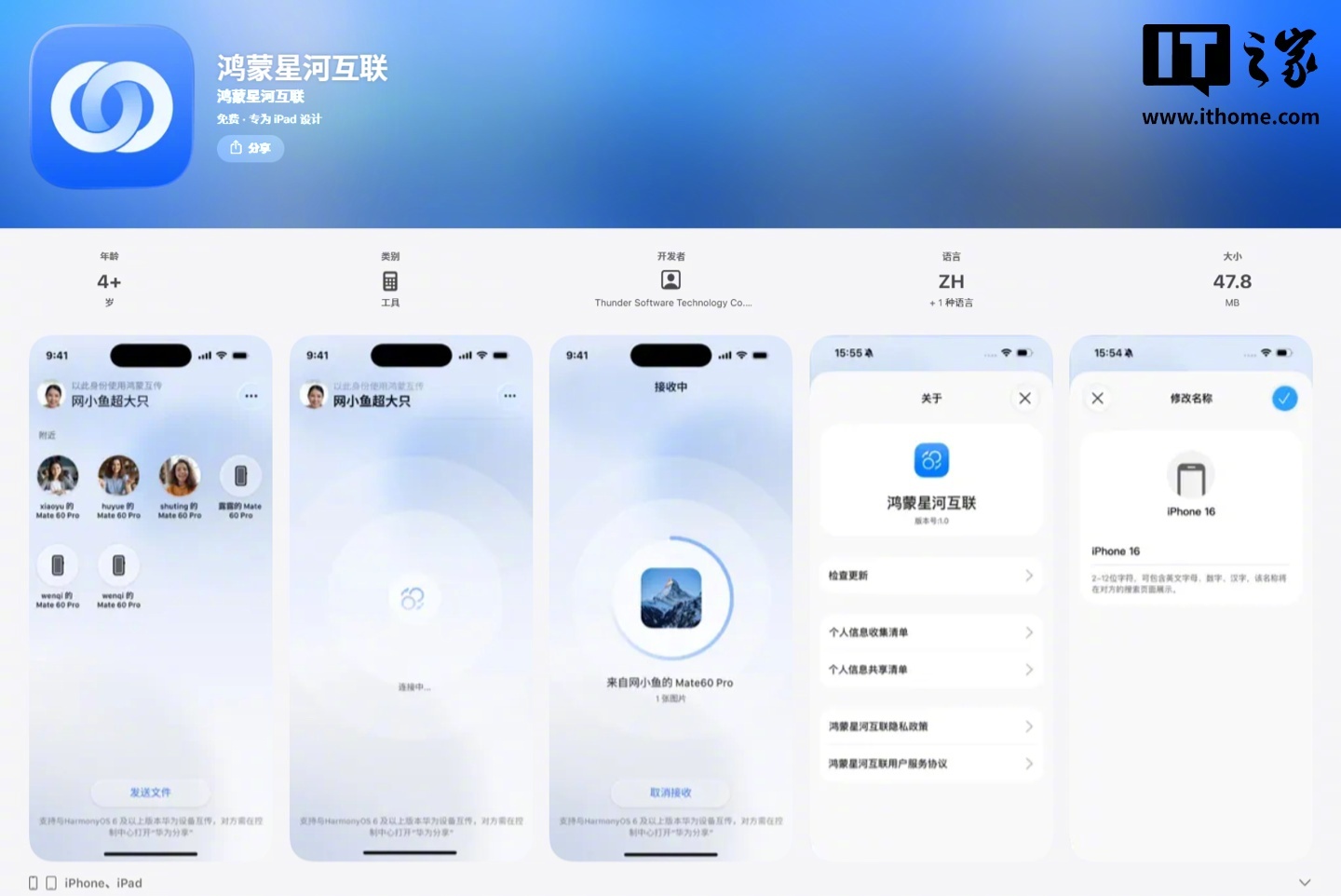 [华为苹果“联上了”:鸿蒙星河互联App首登AppStore,支持文件等互传]鸿蒙星河互联App现正式登陆苹果AppStore,首次支持了华为鸿蒙系统设备(要求HarmonyOS6.0系统)与苹果iPhone/iPad的通讯录、图片、视频和文件等内容的互传,意味着华为与苹果终于“联上了”。