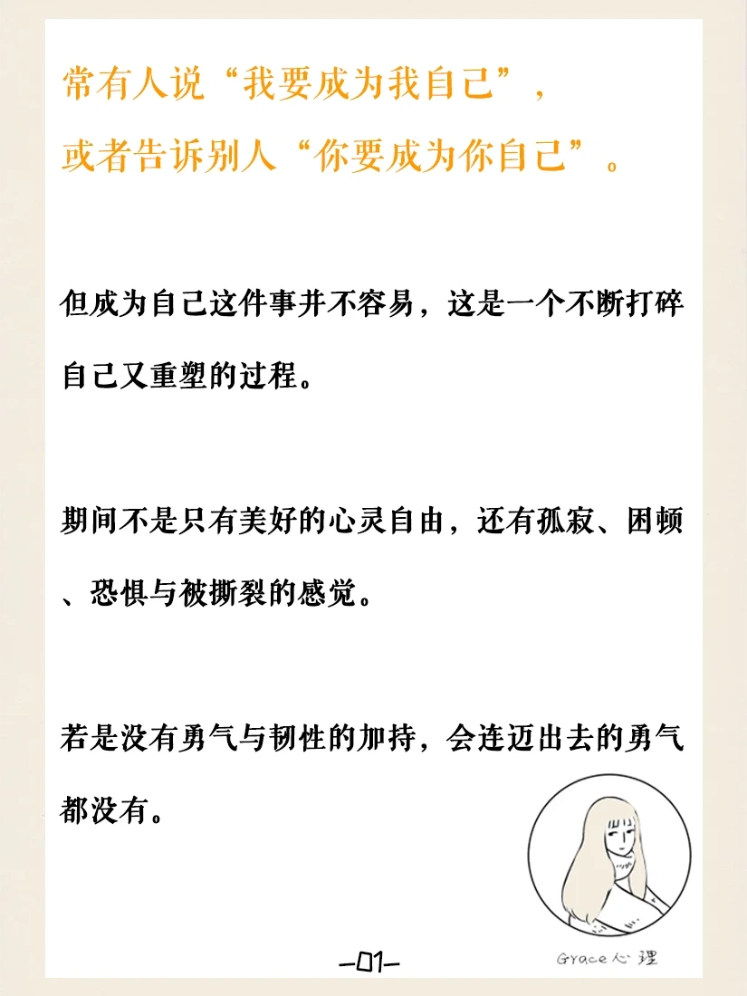 🌟常有人说“我要成为我自己”,或者告诉别人“你要成为你自己”。但成为自己这件事并不容易,这是一个不断打碎自己又重塑的过程,期间不是只有美好的心灵自由,还有孤寂、困顿、恐惧与被撕裂的感觉。若是没有勇气与韧性的加持,会连迈出去的勇气都没有。