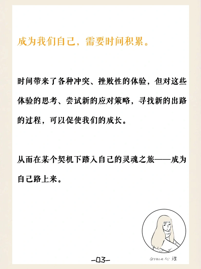 ▪️成为我们自己,需要时间积累。时间带来了各种冲突、挫败性的体验,但对这些体验的思考、尝试新的应对策略,寻找新的出路的过程,可以促使我们的成长,从而在某个契机下踏入自己的灵魂之旅——成为自己路上来。