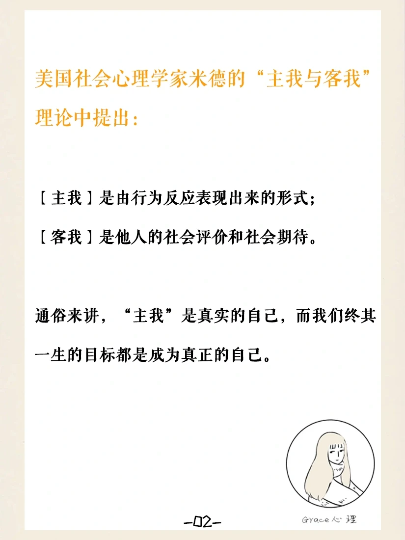 🔹美国社会心理学家米德的“主我与客我理论”中提出,“主我”是由行为反应表现出来的形式,“客我”是他人的社会评价和社会期待。通俗来讲,“主我”是真实的自己,而我们终其一生的目标都是成为真正的自己。