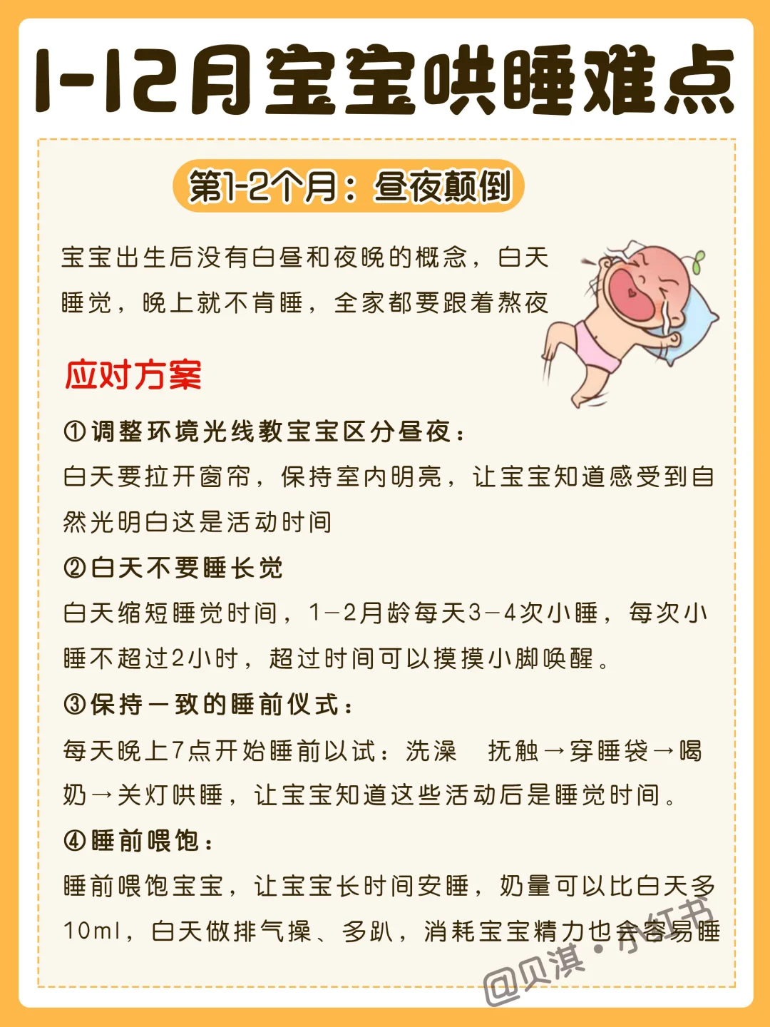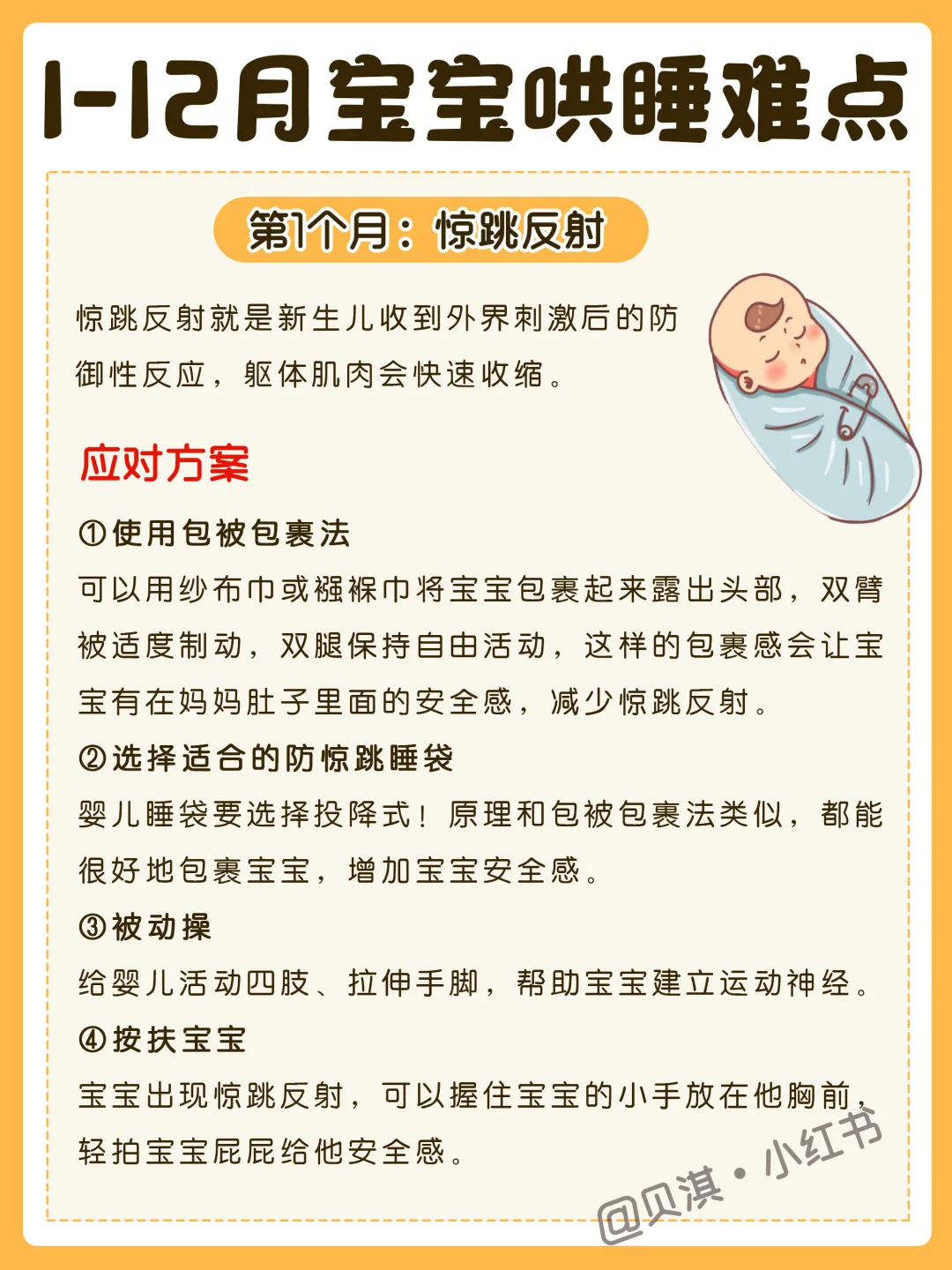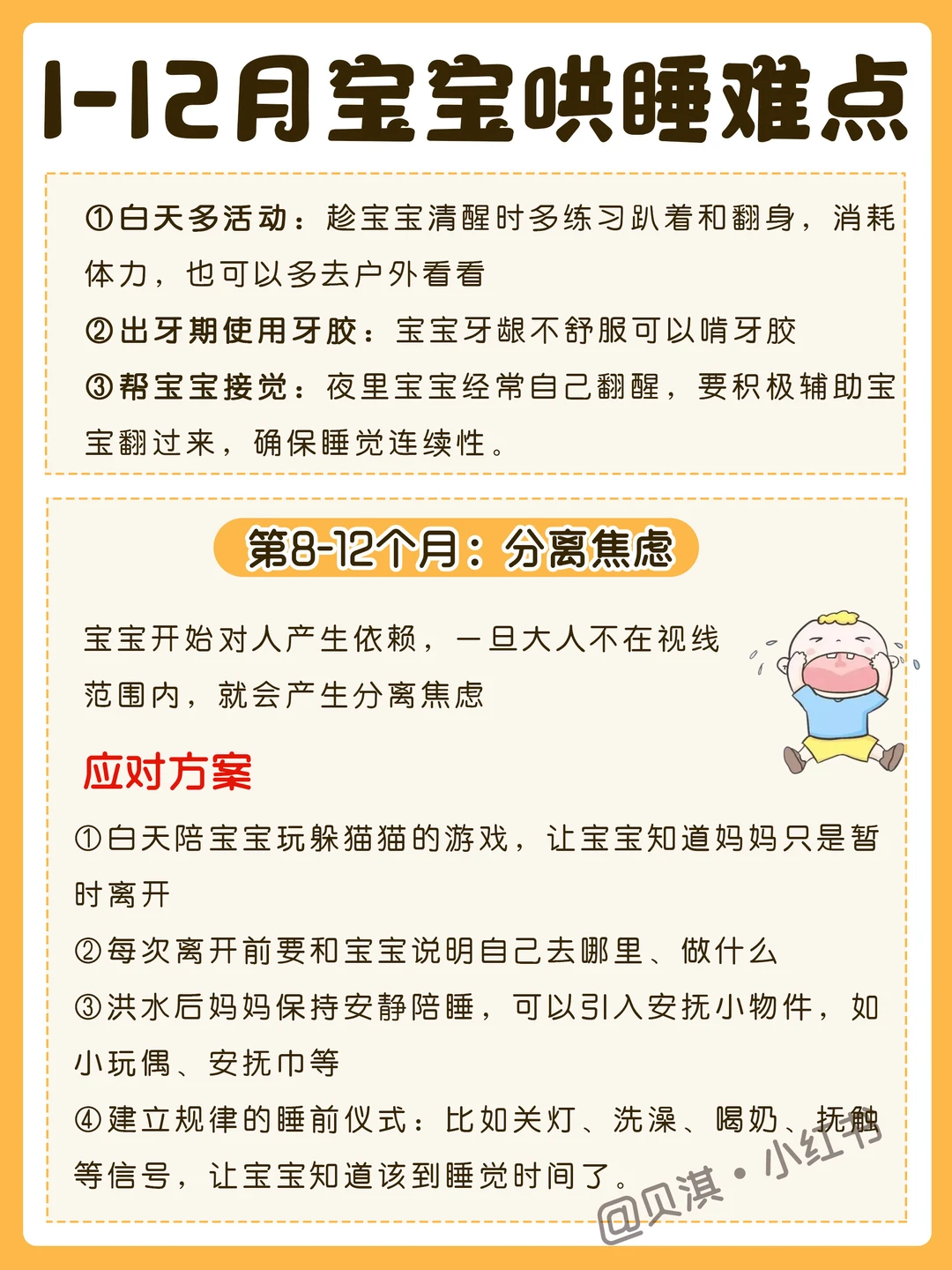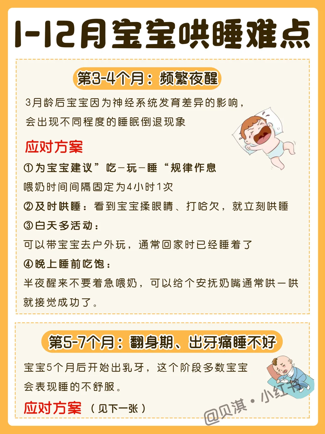 宝宝1-12个月的哄睡难点都整理在图片上了,建议保存起来以备不时之需,如果还有相关疑问欢迎评论区探讨,如果落地醒具体方法还不清楚可以评论区留言,下一期手把手教姐妹避免落地醒。